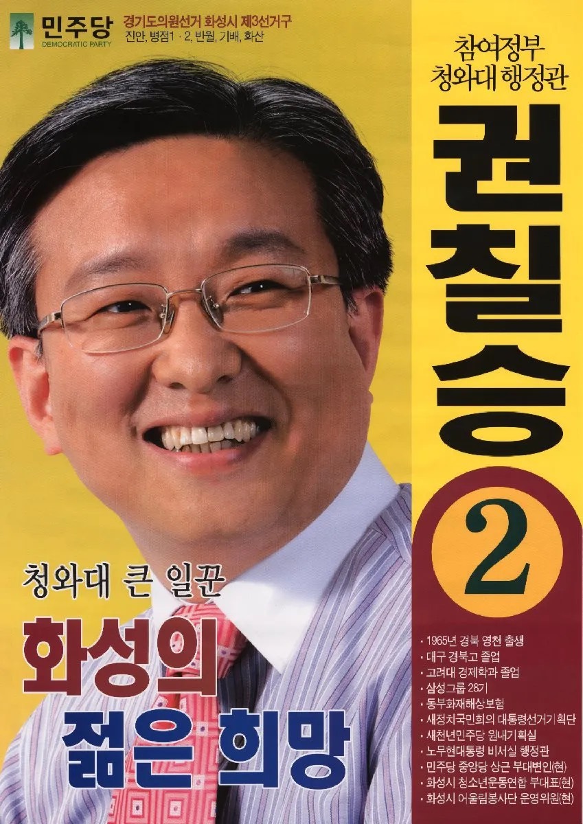 권칠승 의원은 경상북도 영천시 화남면 선천리에서 태어나 고려대학교 경제학과를 졸업하고, 육군 방위병 복무와 기업 근무 경험을 바탕으로 정치의 길에 들어섰습니다. 1997년 김대중 대통령 후보 선거기획단에서 실무를 맡으며 정치 활동을 시작한 그는, 이후 청와대와 중앙당에서 다양한 행정 경험을 쌓으며 노무현 정부 청와대 행정관과 문재인 정부 중소벤처기업부 장관을 역임했습니다. 경기도의회 의원으로서 지역사회의 현안을 해결하고 조례를 제정하며 실력을 인정받았으며, 20대 국회에서는 화성병 지역구에서 당선되어 지역 발전과 교육 문제 해결에 앞장섰습니다. 21대 총선에서는 재선에 성공하며 공약으로 추진한 초등학교 개교를 실현했고, 의료법 개정안 발의 등 사회적 정의 실현에도 적극 나섰습니다. 수석대변인과 장관직을 겸하며 당내에서도 중진으로 자리 잡았고, 3선 국회의원으로서의 경험을 바탕으로 2026년 경기도지사 출마를 선언하며 지역과 국가를 위한 비전을 제시했습니다. 그의 정치 여정은 중앙과 지방을 오가며 쌓은 풍부한 경험과 지역 주민과의 긴밀한 소통 속에서 유기적으로 이어지고 있습니다. 이러한 배경과 경력을 바탕으로 권 의원은 실천력 있는 정치인으로 평가받고 있습니다.