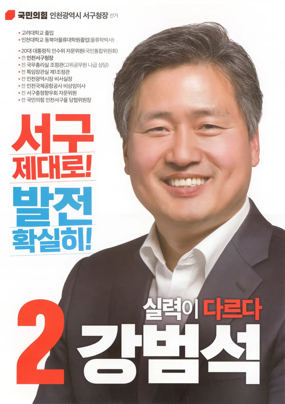 정계에서 물러나지 않고 끊임없이 자신을 단련해온 그는 2021년 국민의힘 인천 서구 을 당협위원장으로 임명되며 정치적 복귀의 기반을 다졌고, 2022년 제8회 지방선거에서 국민의힘 후보로 출마해 박빙의 접전 끝에 서구청장으로 재선에 성공하였습니다. 2.35%p 차이라는 접전 속에서도 승리를 거두며 강 구청장은 명실공히 지역 정치를 이끄는 핵심 인물로 자리매김하였습니다.