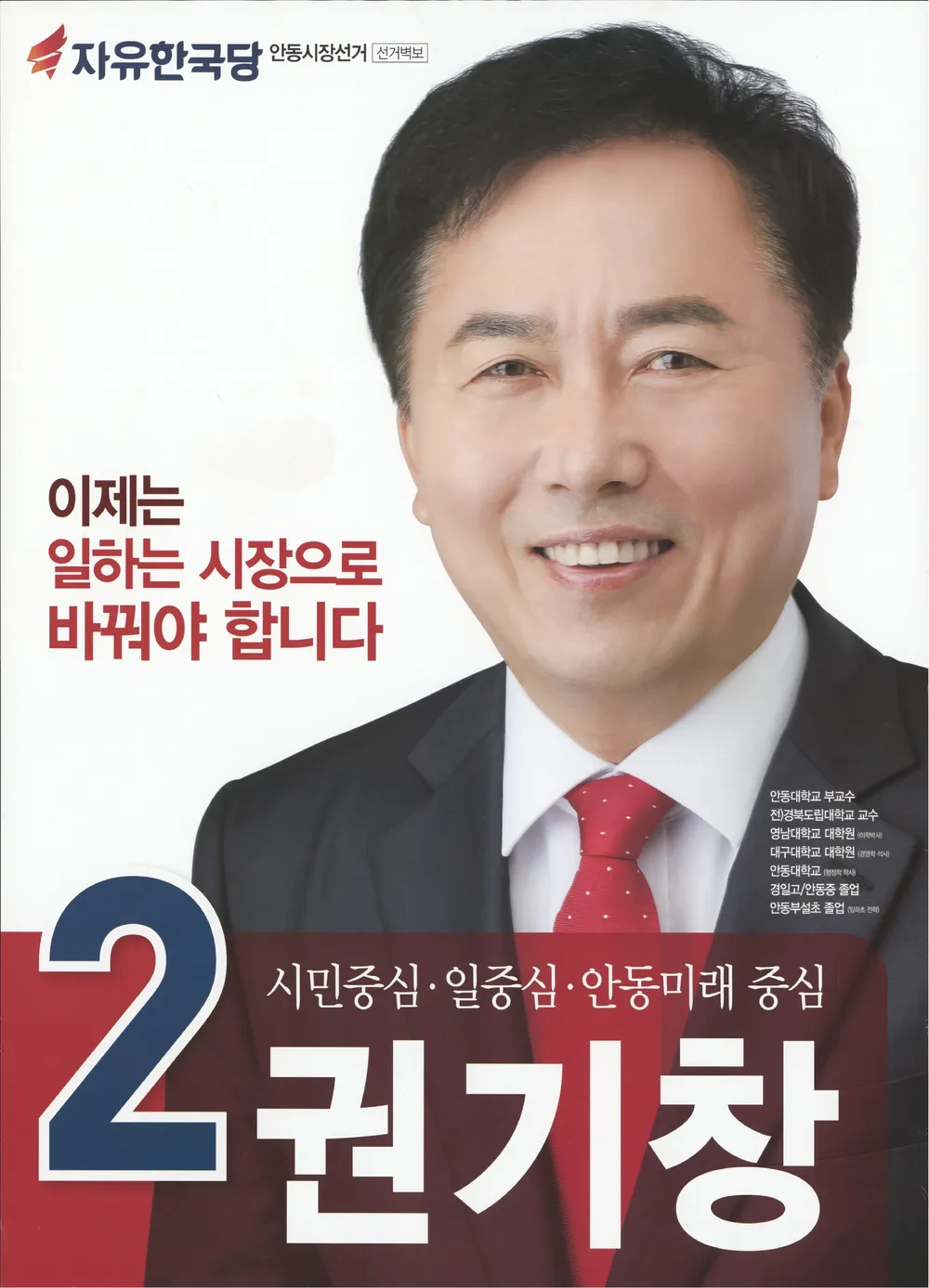 권기창 안동시장은 교육계와 행정 분야를 두루 거친 학자 출신 정치인으로, 현재 경상북도 안동시의 발전을 이끌고 있는 인물로 알려져 있습니다. 그는 평생을 지역과 시민을 위해 헌신하며, 안동을 새로운 성장 중심지로 도약시키겠다는 확고한 비전을 가지고 있습니다. 교육자 시절부터 지역 인재 양성과 문화 발전에 힘써왔고, 시장 취임 이후에는 미래 산업 육성과 도시재생, 청년 정책 등에 집중하며 변화와 혁신의 시정을 펼치고 있습니다. 권 시장은 “위기의 안동을 기회의 안동으로”라는 기치 아래 시민과의 소통을 무엇보다 중요시하고, 공정하고 따뜻한 행정을 통해 신뢰받는 지방정부를 만드는 데 주력하고 있습니다. 또한 문화와 전통, 산업이 조화를 이루는 지속 가능한 도시를 목표로, 안동의 역사와 정체성을 지키면서도 세계로 나아가는 발전 전략을 추진하고 있습니다. 그의 행정철학은 ‘시민 중심, 미래 중심, 현장 중심’으로 요약되며, 이는 모든 정책의 근간이 되고 있습니다. 지역의 변화와 성장을 위해 쉼 없이 달려온 권기창 시장의 발자취는 안동의 새로운 시대를 여는 원동력으로 평가되고 있습니다.