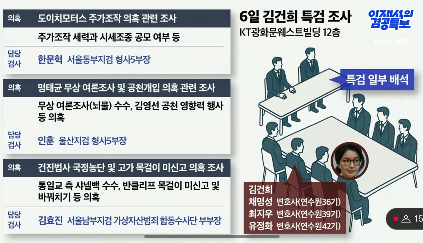 도이치모터스 주가조작 사건은 자본시장법 위반 혐의로, 김 여사가 2010년대 초반 도이치모터스 주가를 인위적으로 띄우기 위해 이른바 ‘선수’들과 공모해 시세조종에 가담했다는 의혹입니다. 이는 검찰에서도 일부 조사가 이루어졌지만, 당시 명확한 결론 없이 마무리된 바 있습니다. 특검은 이를 다시 들여다보며 김 여사의 직접 개입 여부를 규명하고자 했습니다.