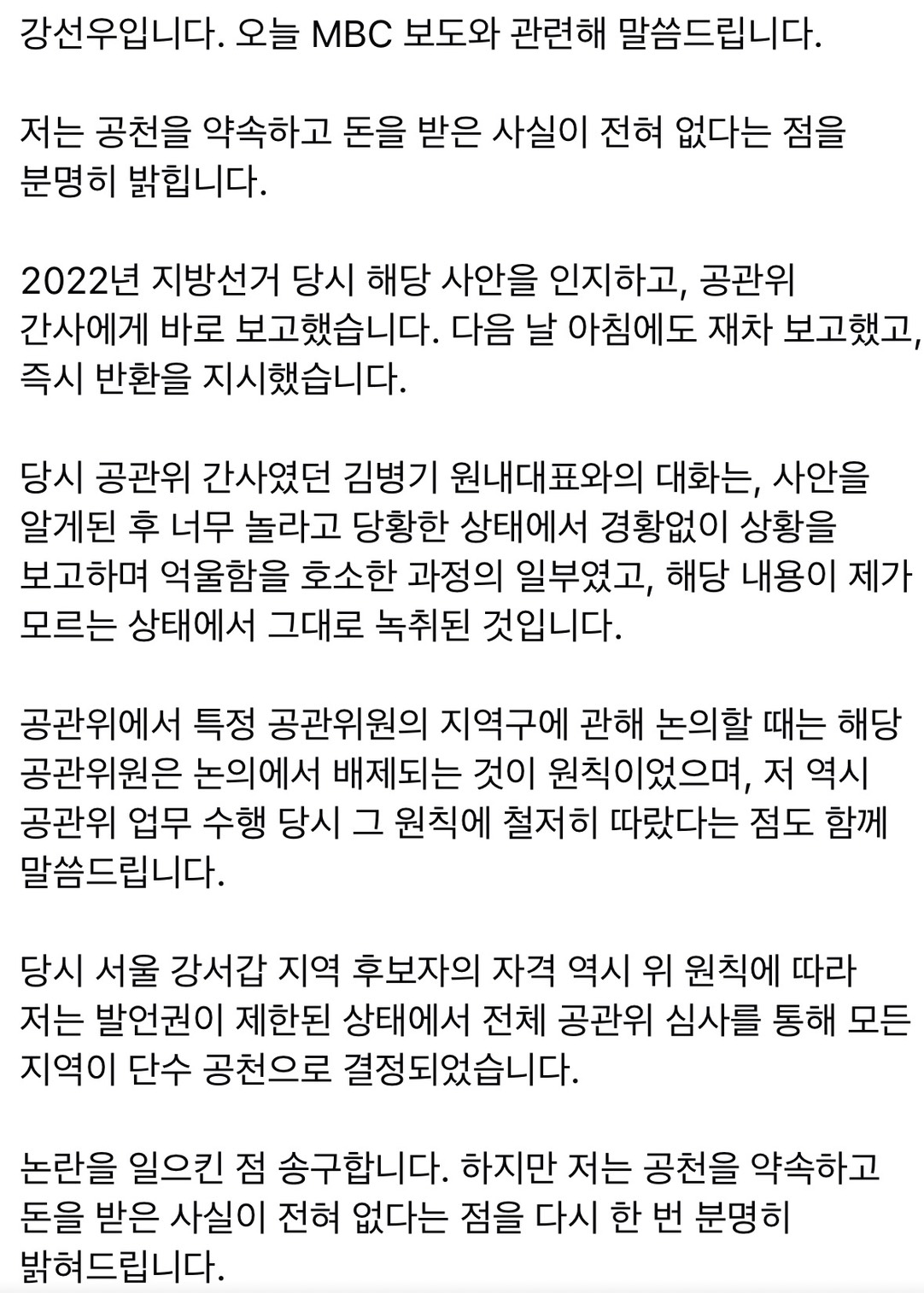 현재까지 당사자들은 모두 혐의를 부인하고 있으며, 실제로 돈이 반환됐는지 여부와 공천 과정에서 부당한 영향이 있었는지는 수사를 통해 가려져야 할 사안으로 남아 있습니다. 이번 논란은 정당의 공천 절차와 정치자금의 투명성에 대한 국민적 불신을 다시 한 번 환기시키고 있다는 평가가 나오고 있습니다.