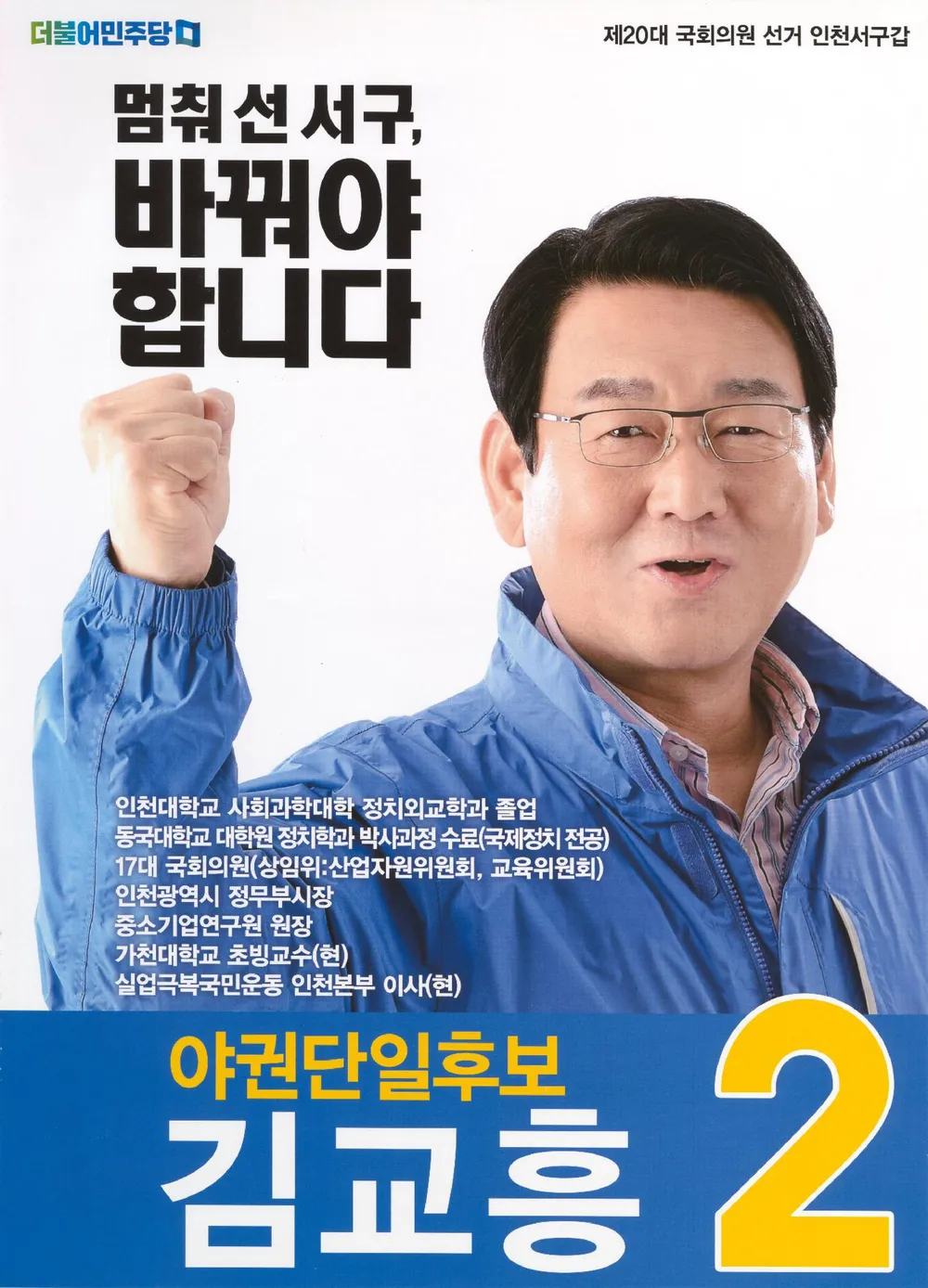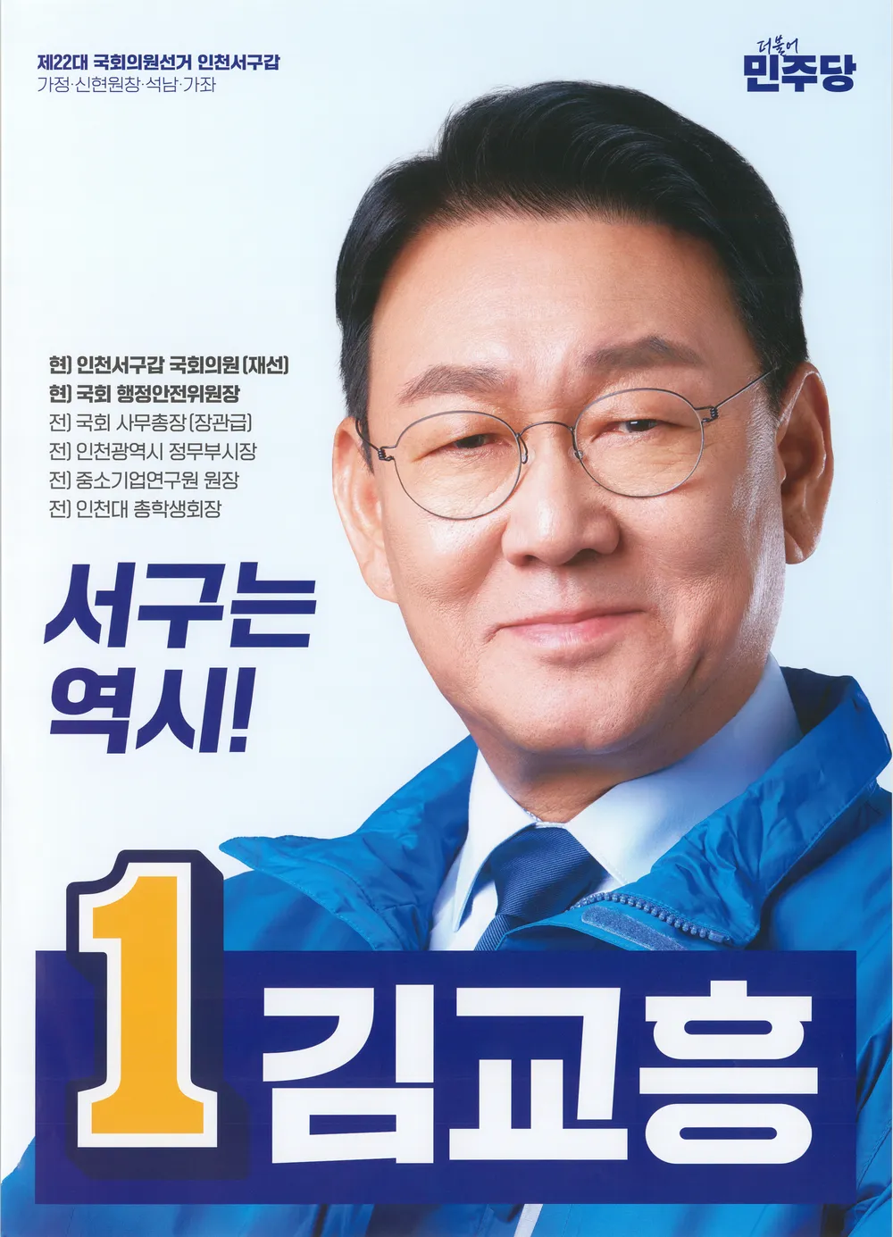 2024년 제22대 총선을 앞두고 선거구 조정이 이루어지면서 김교흥 의원은 청라국제도시가 포함된 서구 을 선거구 출마 가능성이 제기되었으나, 결국 원도심과 루원시티 중심의 서구 갑 선거구에 다시 도전하게 되었습니다. 결과적으로 국민의힘 박상수 후보와의 대결에서 압도적인 승리를 거두며 3선 고지에 올랐습니다.