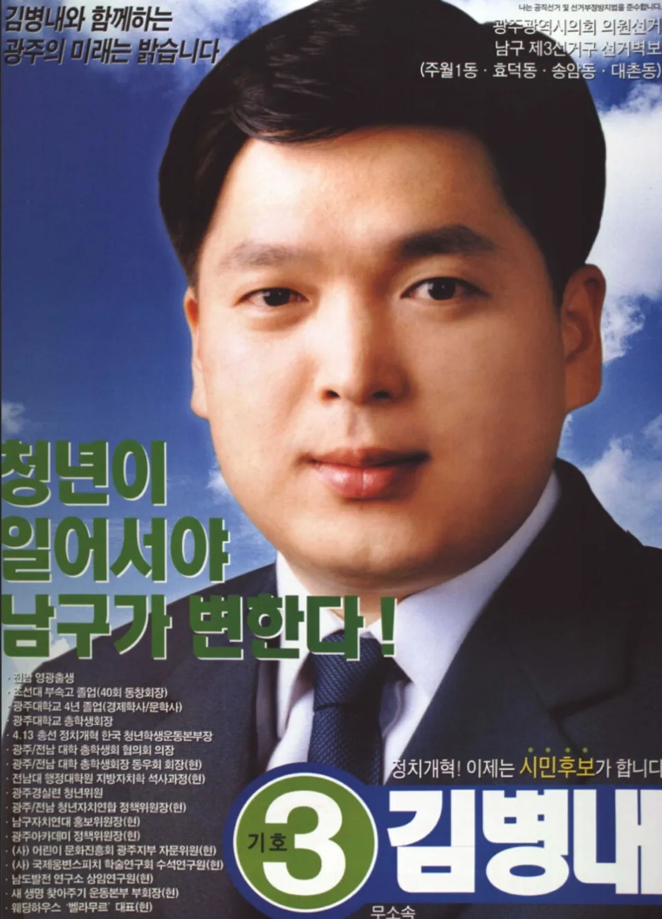복학 후에는 광주대학교 총학생회장과 광주전남대학총학생회 연합의장을 맡아 청년들의 목소리를 대변했습니다. 또한 광주경제정의실천시민연합 청년위원으로 활동하며 사회정의와 시민 참여의 중요성을 실천했습니다. 젊은 시절부터 ‘공공의 이익을 위한 봉사’라는 신념을 행동으로 보여준 셈입니다.