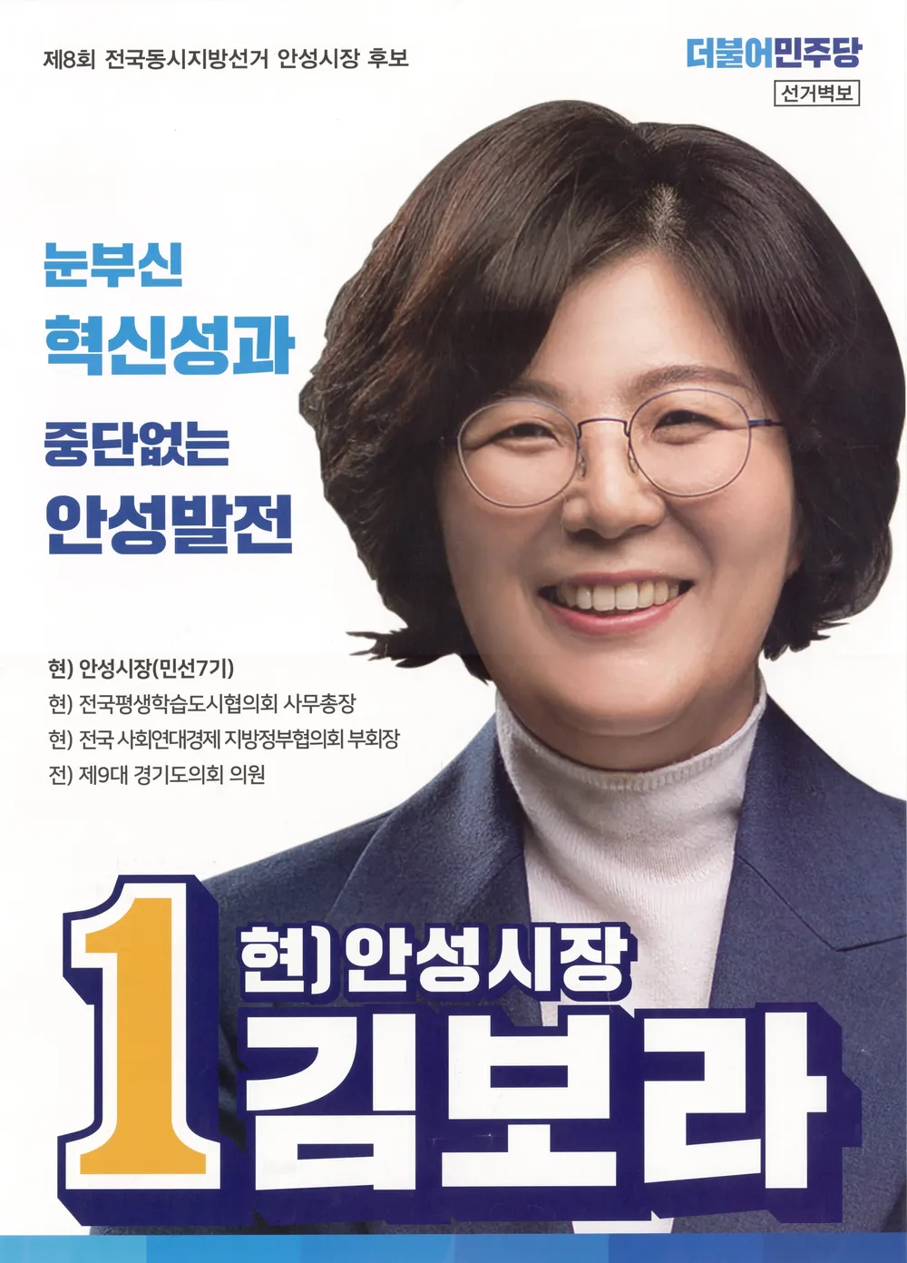2022년 지방선거에서 김보라 시장은 재선에 도전했습니다. 당시 더불어민주당이 전국적으로 열세를 보이던 상황에서도 불과 567표 차이로 국민의힘 후보를 꺾고 다시 안성시장의 자리에 올랐습니다. 첫 당선보다 득표율을 오히려 높였다는 점에서 김보라 시장의 성실한 시정과 시민 중심의 행정이 긍정적인 평가를 받았음을 보여줍니다. 재선 확정 직후 그녀는 “안성시민이야말로 진정한 승자이며, 시민 모두의 시장이 되겠다”고 말하며 정치적 포용과 화합의 의지를 밝혔습니다. 또한 “당의 시장이 아니라 시민의 시장으로 남겠다”며 20만 안성시민 모두가 함께하는 도시를 만들겠다는 비전을 제시했습니다.