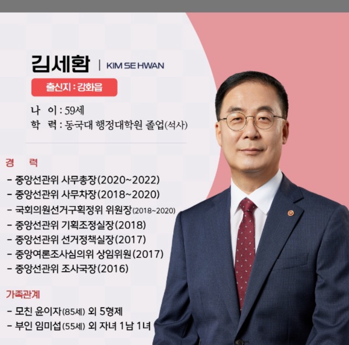 김세환 전 중앙선거관리위원회 사무총장은 1964년생으로, 중앙선거관리위원회에서 중요한 직책을 역임하며 선거의 공정성을 확보하는 데 기여한 인물입니다. 그는 선거와 관련된 법적 문제와 절차에 대한 풍부한 경험을 바탕으로 중앙선관위의 조직을 이끌었으며, 공직선거와 관련된 다양한 개혁을 추진했습니다. 또한, 선거관리의 투명성과 효율성을 강화하는 데 중요한 역할을 맡았던 인물로 평가받고 있습니다. 오늘은 9급 공무원에서 장관급 선과위 사무총장까지 올라간 김세환 전 중앙선관위 사무총장의 프로필 / 나이 / 학력 / 고향 / 가족관계 / 강화군수 출마 / 소속 정당에 대해서 이야기 나누어 보겠습니다.