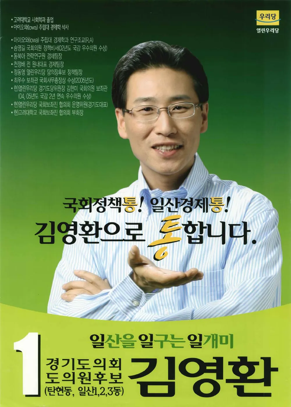 김영환 국회의원은 전라북도 전주시에서 태어나 경기도 고양시를 기반으로 정치 활동을 이어온 실용적이고 성실한 정치인입니다. 보좌관으로 정치에 입문한 후, 경기도의원 두 차례 재선, 그리고 국회의원 당선에 이르기까지 지역과 국민을 위한 일관된 행보를 보여왔습니다. 사회학 전공과 경제학 석사 과정을 통해 쌓은 학문적 기반 위에, 현장에서의 풍부한 경험을 더해 실효성 있는 정책을 추구하는 정치인으로 평가받고 있습니다. 군 복무와 유학, 정치 실무와 선거 경험 등 다양한 삶의 여정은 그를 더욱 단단하게 만들었습니다. 김 의원은 특히 지역민들과의 소통을 중시하며, 현장의 목소리를 정책에 반영하는 데 집중해 왔습니다. 경기도의원 시절부터 시작된 생활 밀착형 의정활동은 국회에서도 그대로 이어지고 있으며, 현재는 기획재정위원회와 예산결산특별위원회에서 활발한 의정활동을 펼치고 있습니다. 더불어민주당 고양시 정 지역위원장으로서, 그리고 최근 당대표 정무조정실장으로서도 중심적 역할을 수행하며 정국에서의 존재감을 키워가고 있습니다.