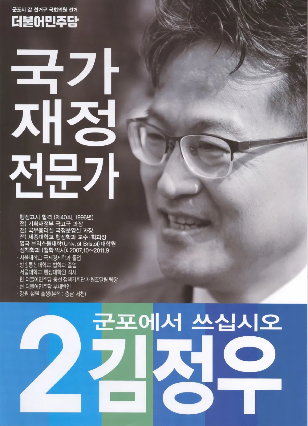 그러나 그의 인생은 다시 한 번 큰 전환점을 맞게 됩니다. 2016년, 더불어민주당은 제20대 총선을 앞두고 신당 창당과 탈당 사태로 위기에 빠졌고, 문재인 전 대표는 당의 쇄신을 위해 외부 인재를 적극적으로 영입하였습니다. 김정우는 이때 8호 영입 인재로 더불어민주당에 입당하게 되었고, ‘새는 돈을 막는 재정 전문가’로서 국회의 필요성과 역할을 강조하며 정계에 입문하게 되었습니다.