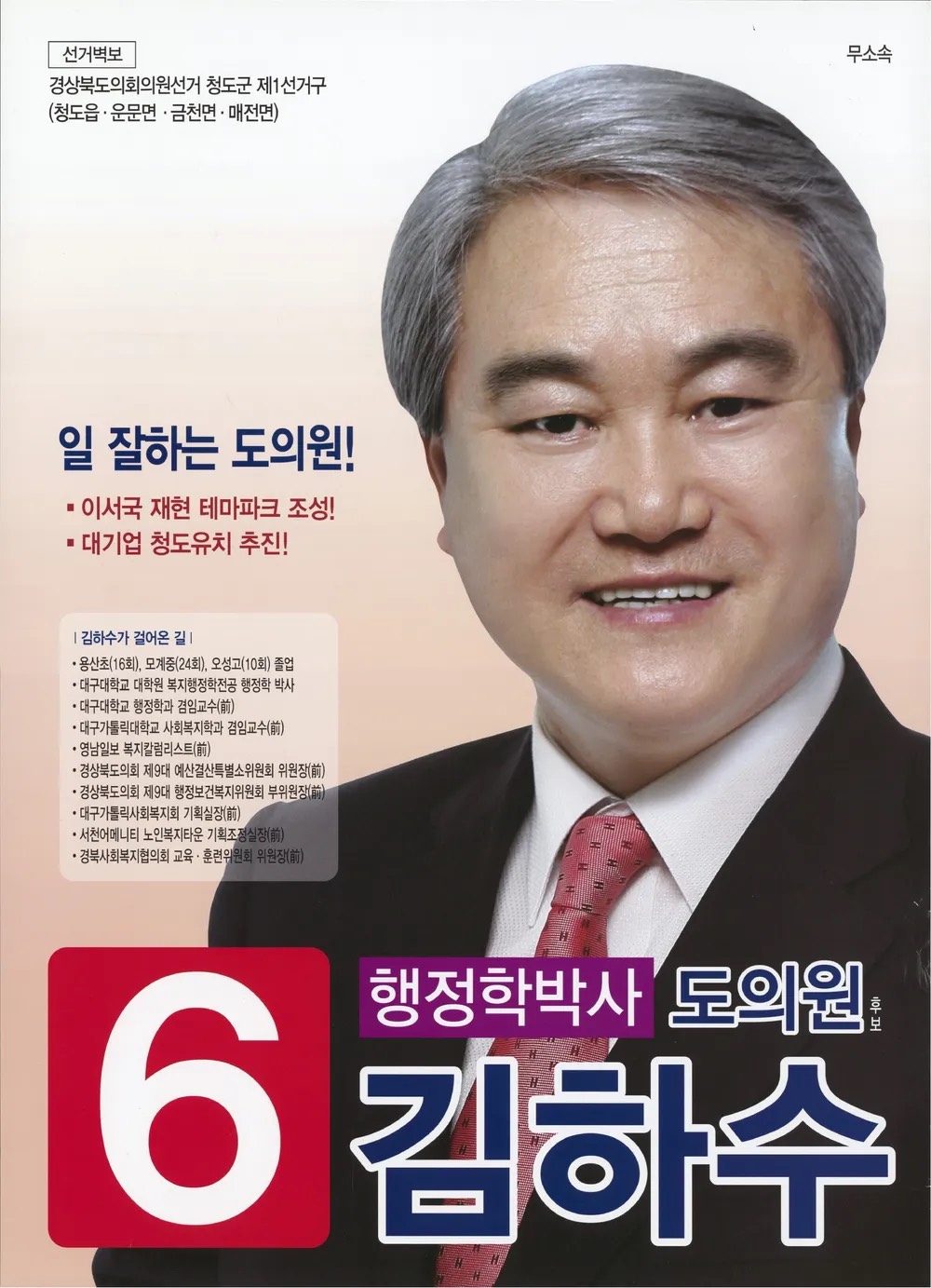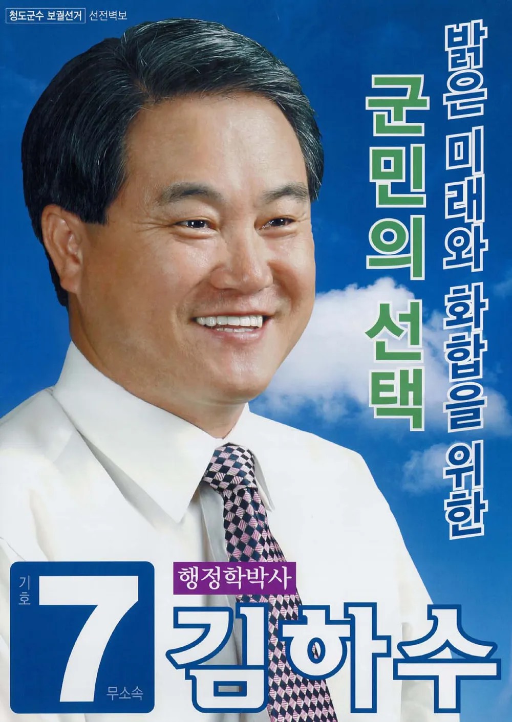 김하수 군수의 정치 여정은 결코 순탄하지 않았습니다. 2006년 제4회 전국동시지방선거에서 무소속으로 청도군수 선거에 처음 도전했으나 아쉽게 낙선했고, 2008년 재보궐선거에서도 다시 한번 무소속 후보로 출마했으나 뜻을 이루지 못했습니다. 이후에도 포기하지 않고 지역 주민들과 꾸준히 소통하며 정치적 기반을 다져 나갔습니다.