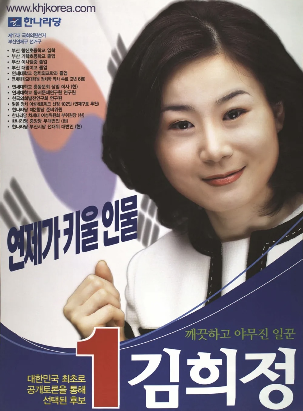 2004년 제17대 국회의원 선거에서 김희정 의원은 한나라당 후보로 부산광역시 연제구에 출마하여 당선되며 정계에 본격적으로 입문하였습니다. 당시 만 33세 2일의 나이로 최연소 당선자였고, 역대 최연소 여성 지역구 국회의원이라는 기록도 세웠습니다. 이후 2007년 대선에서는 한나라당 경선에서 이명박 후보를 지지하며 친이계로 분류되었습니다. 그러나 2008년 제18대 국회의원 선거에서는 친박연대 박대해 후보에게 밀려 낙선하였고, 이후 이명박 정부에서 한국인터넷진흥원 원장과 청와대 대통령실 대변인을 역임하며 행정부 경험을 쌓았습니다.