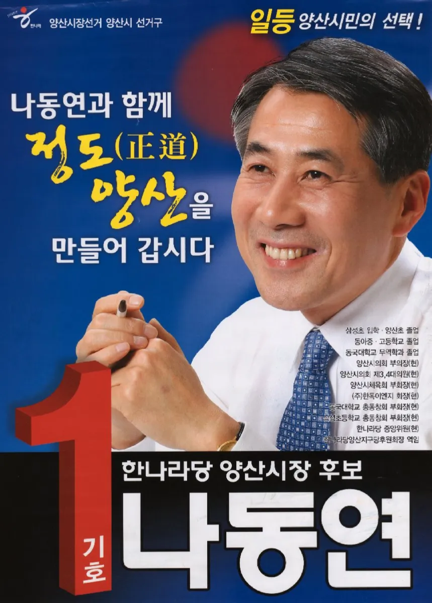 나동연 시장은 2002년 제3회 전국동시지방선거에서 무소속으로 출마해 양산시의회 의원으로 당선되며 정치 활동을 시작했습니다. 2006년에는 한나라당 후보로 재선에 성공하였고, 2008년부터는 시의회 부의장을 맡으며 지방의회 경험을 쌓아갔습니다. 그리고 2010년, 마침내 경상남도 양산시장 선거에 출마하여 당선되며 민선 5기 양산시장으로 시정 운영의 수장을 맡게 됩니다. 이후 2014년에도 새누리당 후보로 재선에 성공하며 양산시장을 연임하게 되었고, 이 시기 부산대학교 국제전문대학원에서 국제학 석사학위를 취득하는 등 학문적인 역량도 함께 키워갔다고 전해집니다.