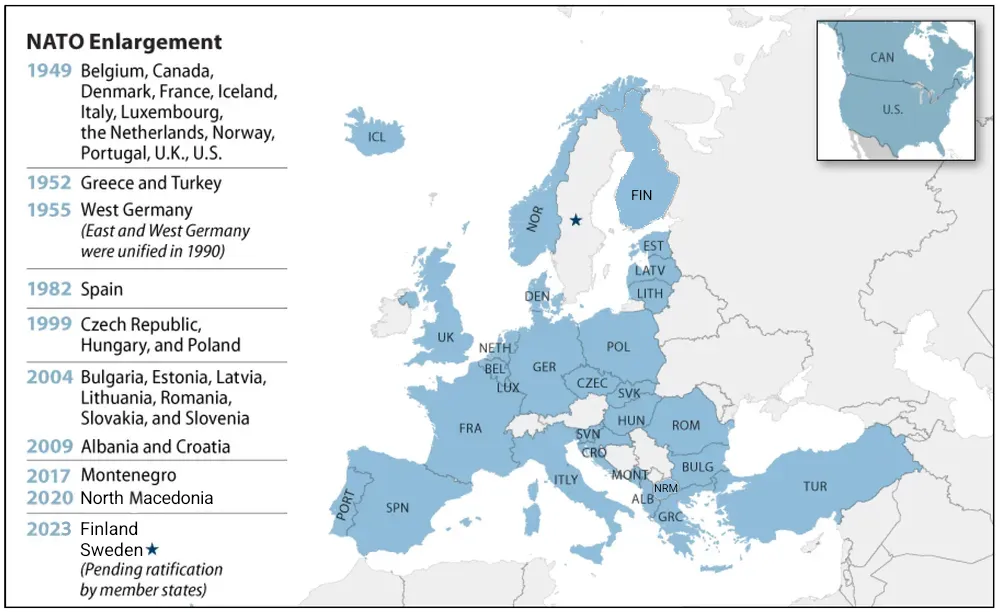 NATO 회원국 (2025년 기준 총 32개국) NATO는 1949년 창설 이후 점진적으로 회원국을 확대하여 현재 총 32개국이 가입되어 있습니다. 아래는 국가별 가입 연도와 함께 정리한 목록입니다.