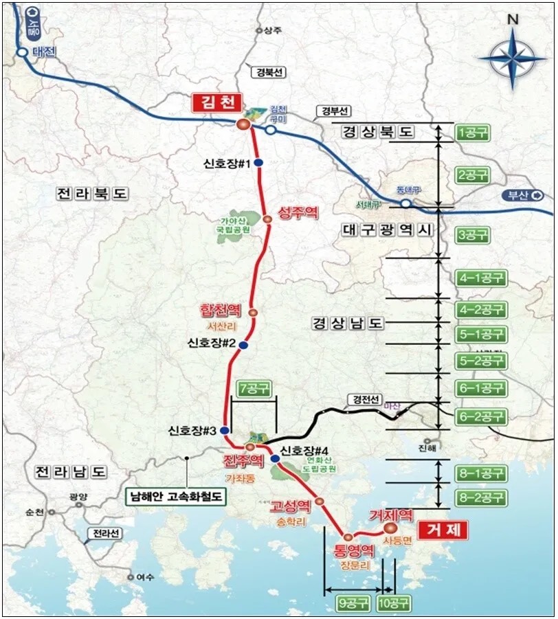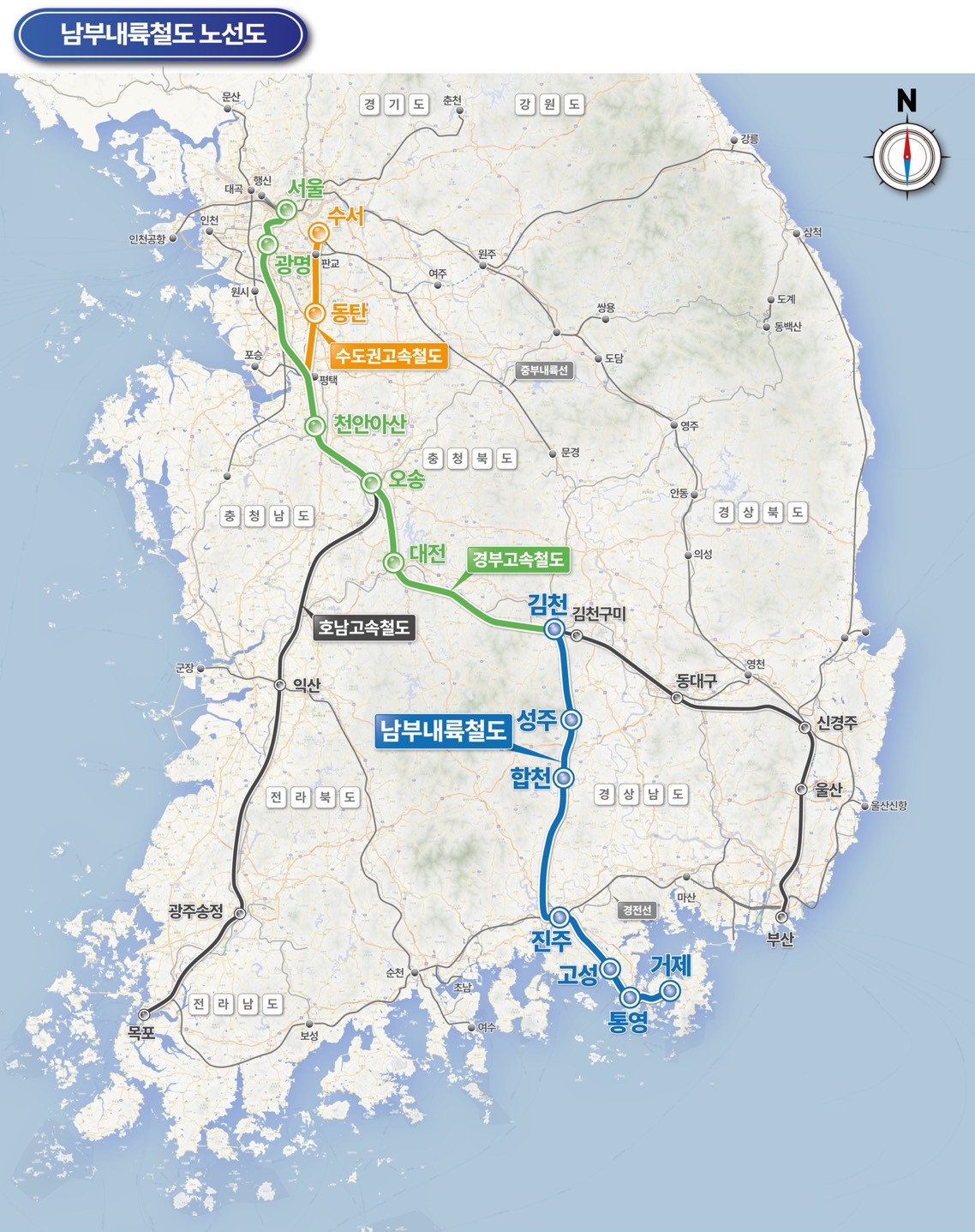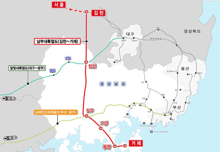 남부내륙철도 노선도•시공사•김천 성주 합천 진주 고성 통영 거제•완공일
