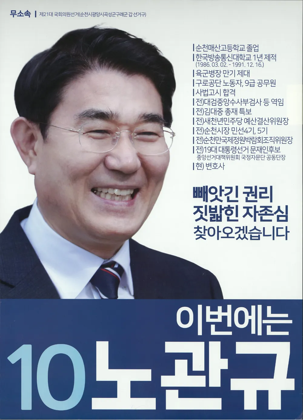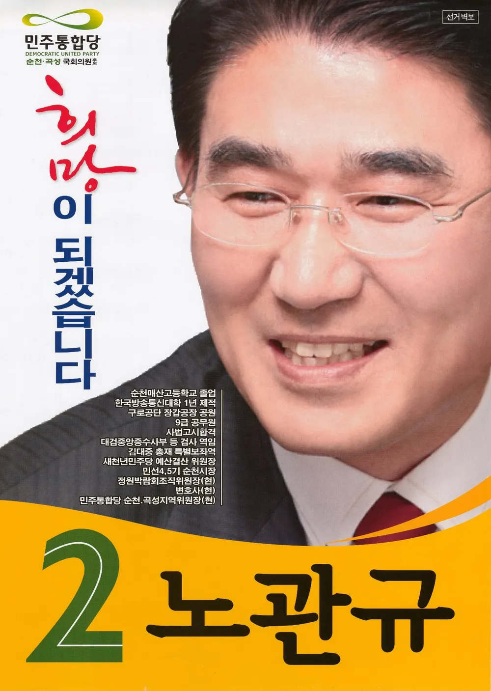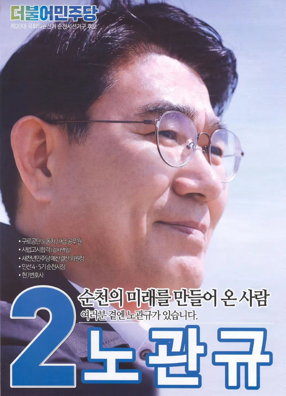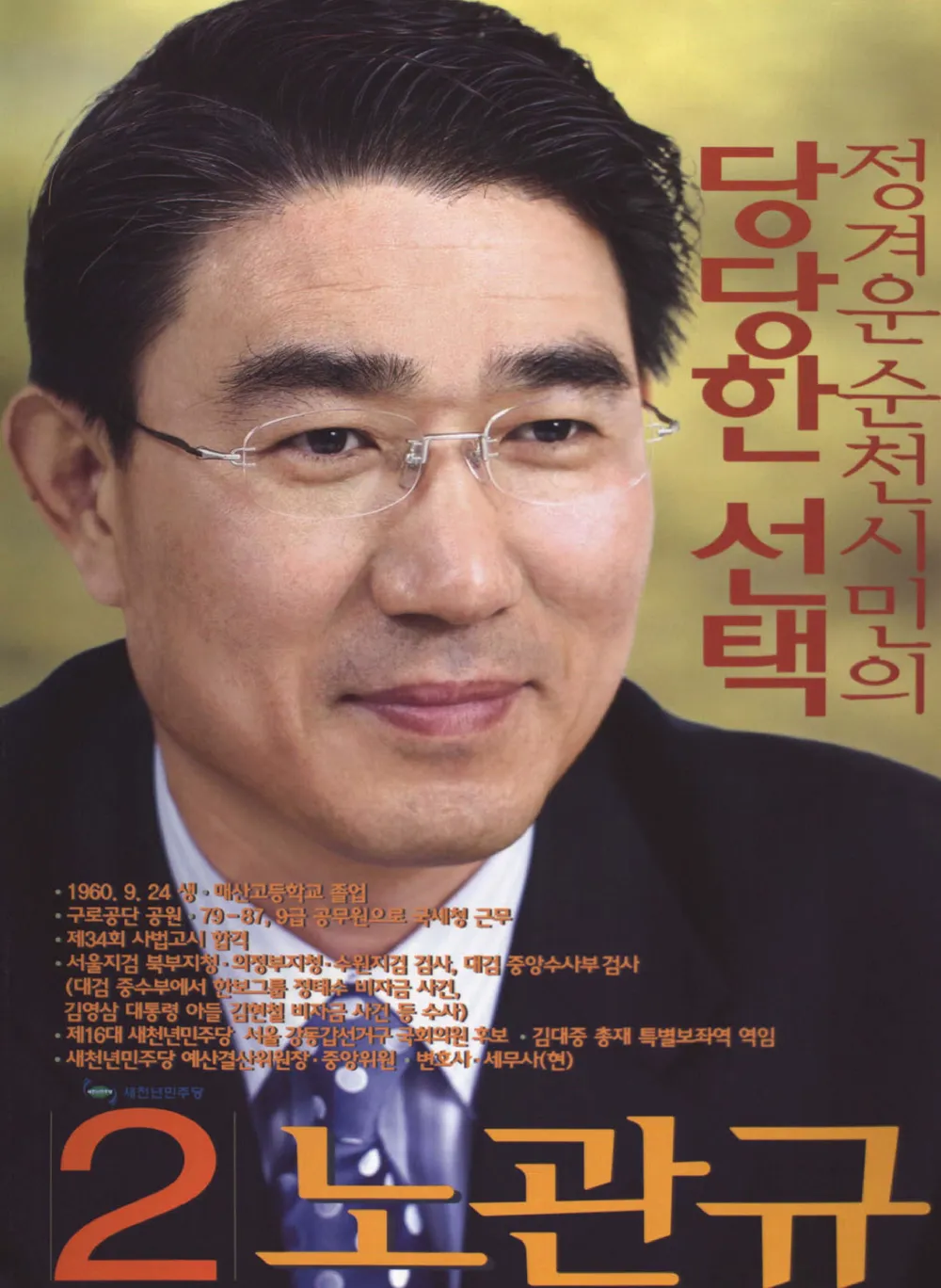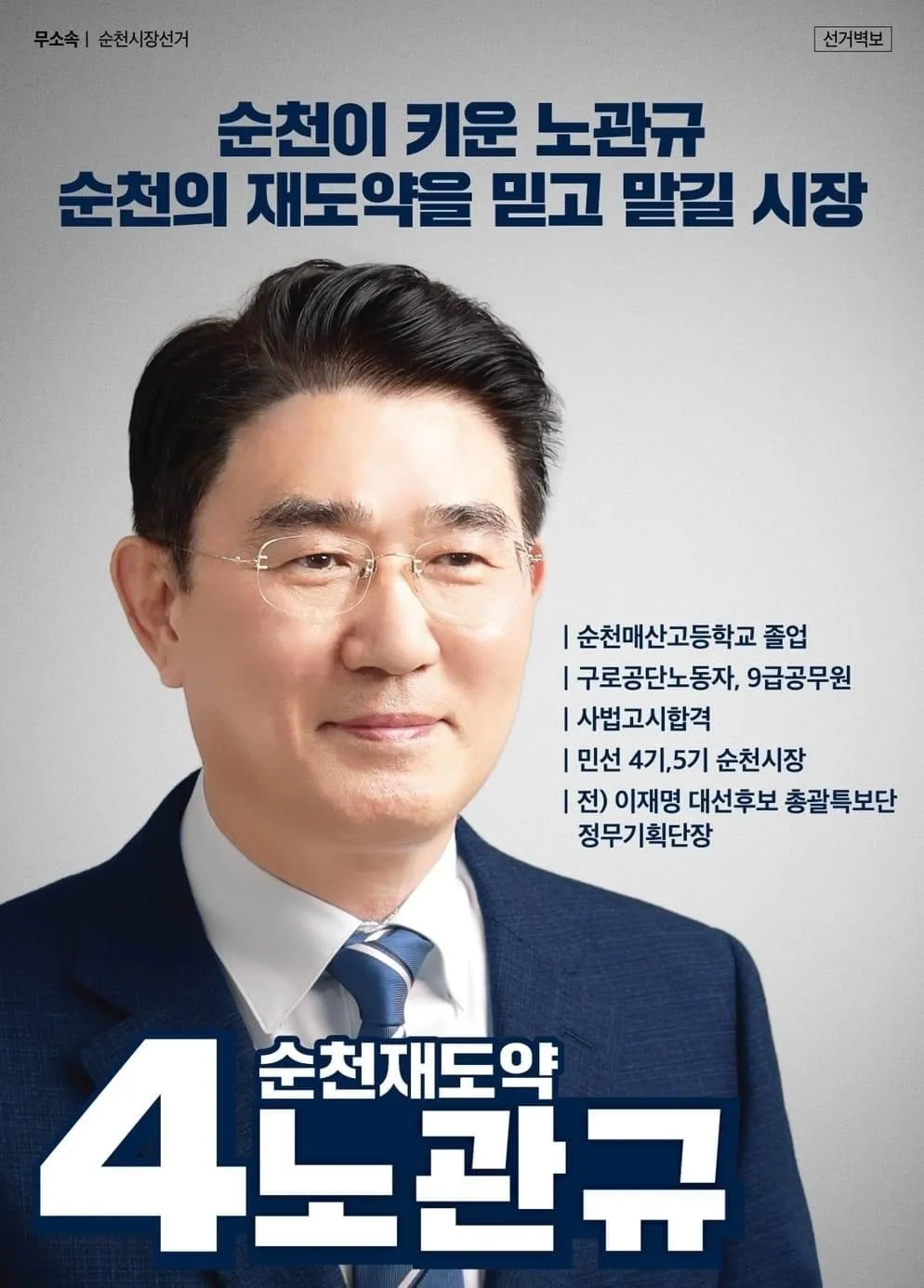 노관규 순천시장은 검사 출신의 정치인으로, 고졸 학력으로 사법시험에 합격한 입지전적인 인물입니다. 1960년 11월 12일 전라남도 장흥군 유치면 용문리의 외가에서 태어나, 유년기에는 장흥과 나주에서 성장기를 보냈다고 전해집니다. 1970년대에는 순천매산고등학교를 졸업하고 상경하여 구로공단 장갑공장에서 노동자로 일하는 등 이른 시절부터 자립적인 삶을 살아왔으며, 이후 세무공무원으로 근무하다 1992년 고졸 신분으로 제34회 사법시험에 합격하며 세간의 주목을 받았습니다. 검사로 재직하던 시절에는 한보그룹 비리와 김현철 사건 등 굵직한 수사에 참여하며 실력을 입증하였고, 이후 정치권에 입문하여 순천과 전남을 중심으로 정치 활동을 이어가고 있습니다.
