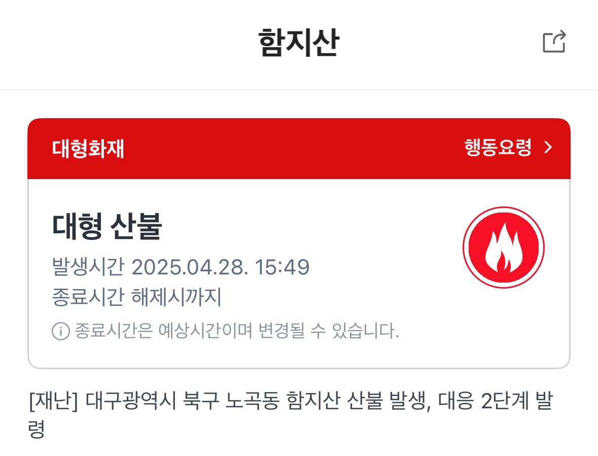 이번 대구 함지산 산불은 강풍과 건조한 날씨 속에 빠르게 확산되며 많은 주민과 소방 인력을 긴장하게 만들었습니다. 총력 진화가 이어지고 있는 가운데, 더 이상의 피해 없이 조속히 불길이 잡히길 간절히 바랍니다. 하루빨리 산불이 완전히 진화되어 지역 주민들이 일상으로 돌아갈 수 있기를 바랍니다.