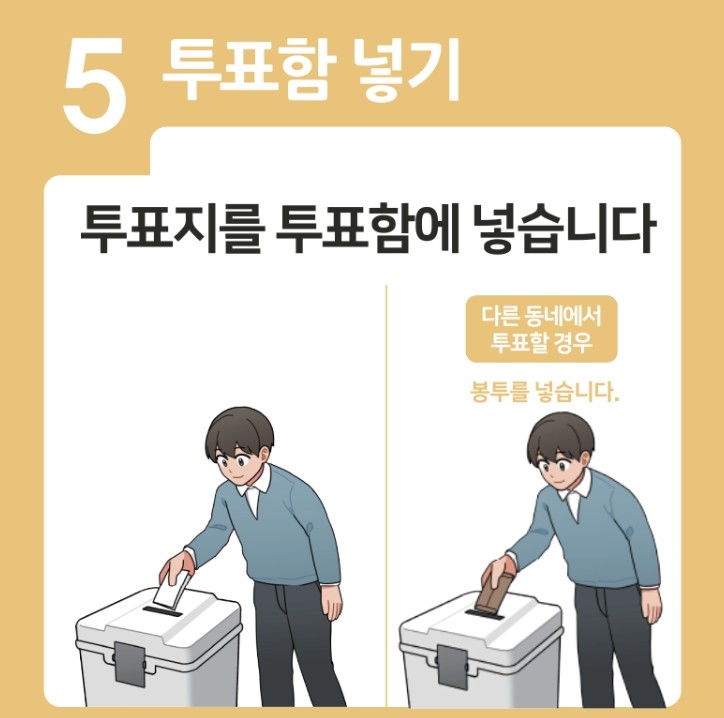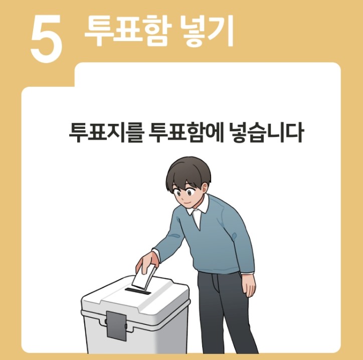 투표소에서는 정해진 절차에 따라 순서대로 진행됩니다. 줄을 서서 대기한 뒤, 신분증을 제시하여 본인 확인을 받고, 이름을 쓰거나 도장을 찍어 서명합니다. 이후 투표용지를 받은 뒤, 기표소 안에서 기표용구로 원하는 후보의 칸 안에 정확히 한 번만 표시하고, 투표용지를 반으로 접어 투표함에 넣습니다. 이 과정이 끝나면 투표소를 나가면 됩니다.