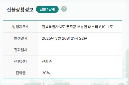 2025년 3월 26일 21시 22분경, 전북특별자치도 무주군 부남면 대소리의 한 건물에서 발생한 불이 인근 야산으로 옮겨붙으면서 산불이 발생했습니다. 불은 부남면의 한 건물에 있던 저온창고에서 누전으로 발생한 것으로 전해졌으며, 이후 불길은 인근 야산으로 확산되어 적상면 야산까지 영향을 미쳤습니다. 3월 26일 밤, 불이 난 지역에는 초속 3.7m/s의 서풍이 불면서 불길은 더욱 빠르게 확산되었고, 부남면에서 발생한 불이 적상면으로 확대되는 상황이 벌어졌습니다.
