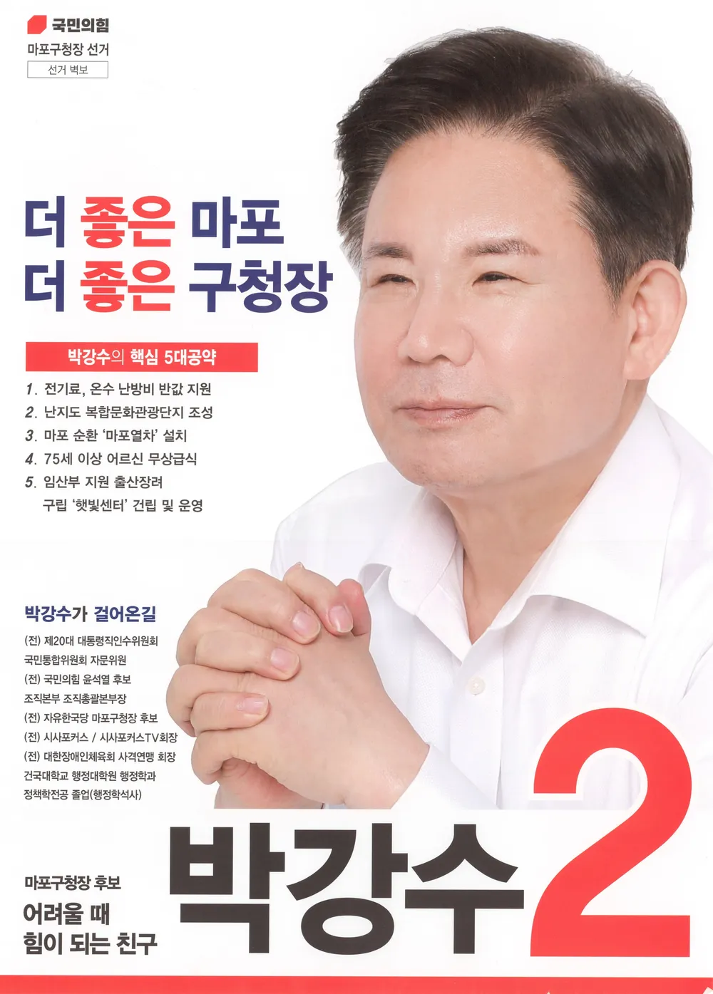 박강수 마포구청장은 언론인과 기업인으로 활동하다 정치에 입문해, 현재 제45대 서울특별시 마포구청장을 맡고 있는 인물입니다. 오랜 시간 지역 사회와 시민단체 활동에 헌신해온 그는, 실천 중심의 행정과 주민 중심의 정책으로 주목받고 있습니다. 특히 복지, 경제, 환경 등 다양한 분야에서 현장감 있는 행정을 통해 구민들과의 신뢰를 쌓아왔다는 평가를 받고 있습니다. 2022년 지방선거에서 치열한 리턴 매치 끝에 구청장에 당선된 이후, 주민 행복도를 크게 끌어올리는 등 의미 있는 성과를 거두고 있습니다. 정치적 경험과 민간 영역에서의 감각을 고루 갖춘 그는 "행정은 결과로 말해야 한다"는 철학을 바탕으로 구정을 이끌고 있습니다. 남은 임기 동안에도 지역 경제 활성화와 사회적 약자를 위한 복지 강화에 집중하며, 마포의 실질적 변화를 이끌겠다는 의지를 보이고 있습니다. 박 구청장이 앞으로 어떤 행보를 이어갈지 관심이 모아지고 있습니다.