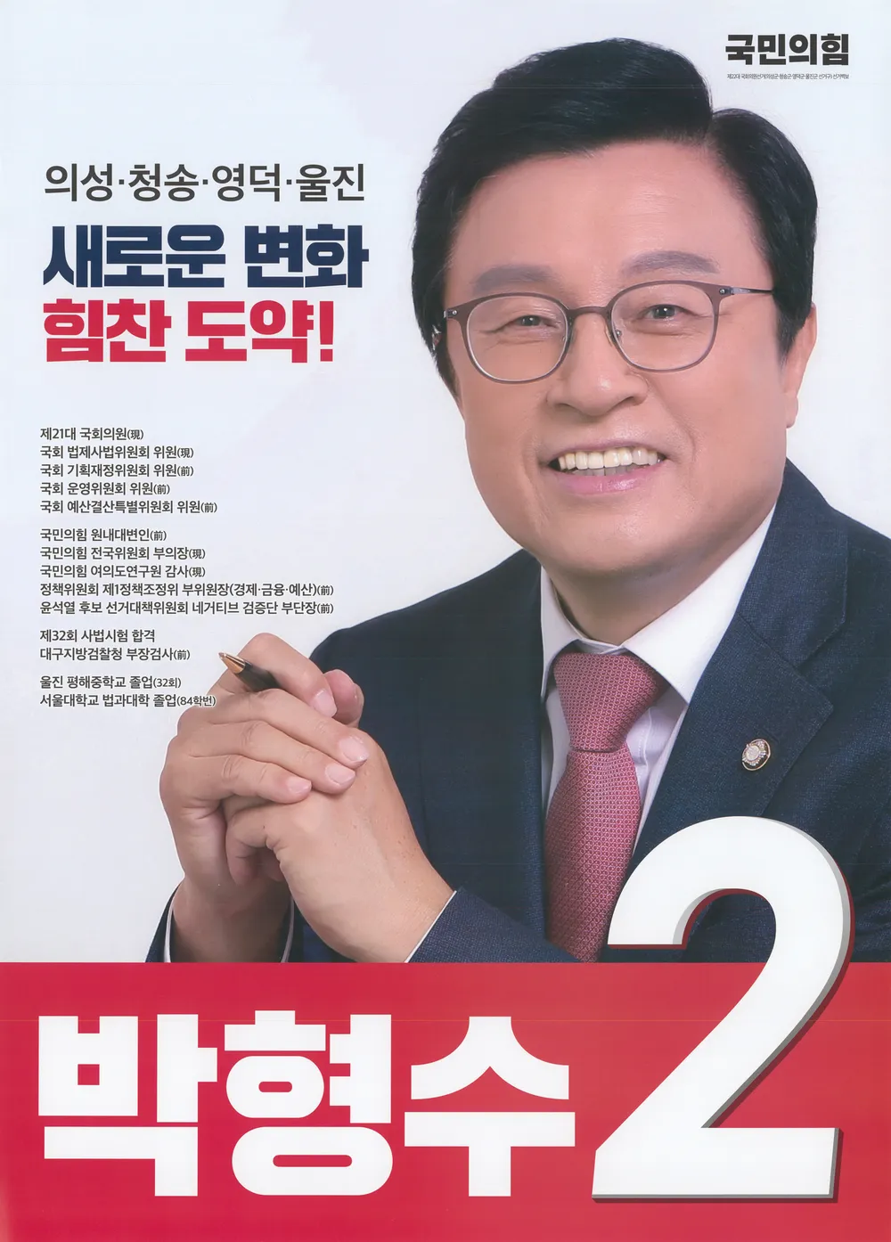 박형수 의원은 검사 출신의 법조인으로, 현재 국민의힘 소속 제22대 국회의원입니다. 강직한 성품과 공정한 법 집행 철학을 바탕으로 오랜 기간 검찰에서 봉직하였으며, 이후 고향 발전과 국민을 위한 정치에 뜻을 두고 정계에 입문하였습니다. 경북 울진 출신으로, 지역 정서와 주민들의 삶을 누구보다 잘 이해하고 있는 인물입니다. 서울대학교 법과대학을 졸업한 뒤 사법시험에 합격해 해군 법무관으로 병역을 마쳤고, 검사로 재직하며 여러 지방검찰청과 고등검찰청에서 주요 보직을 두루 거쳤습니다. 2020년 제21대 총선을 통해 처음 국회에 입성한 이후, 뛰어난 입법활동과 꼼꼼한 지역 챙김으로 주목받고 있습니다. 특히 법제사법위원회와 예산결산특별위원회에서의 활약이 두드러지며, 국민의힘 내에서도 신뢰받는 중진급 정치인으로 자리잡고 있습니다. 현재는 고향이 포함된 경북 의성군·청송군·영덕군·울진군 지역구를 대표하고 있습니다.