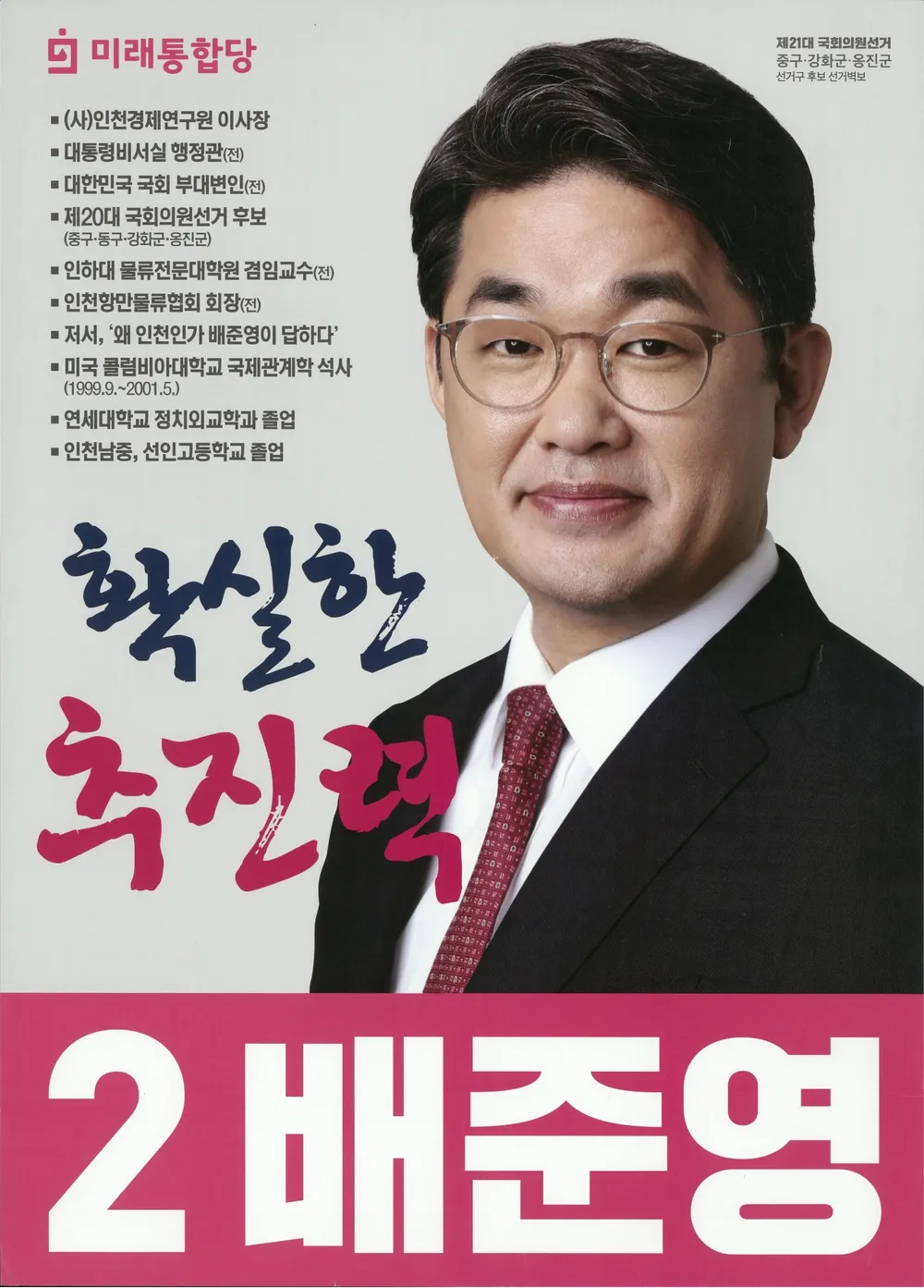 배준영 의원은 지역 발전과 민생 개선을 최우선 과제로 삼아 꾸준히 실천해온 정치인입니다. 인천 중구·강화군·옹진군을 중심으로 한 지역 밀착형 정책 추진과 교통·물류 인프라 개선 등 실질적인 성과를 통해 주민들의 높은 신뢰를 얻고 있습니다. 당내에서는 전략과 기획, 조직 운영 전반을 아우르는 중책을 맡으며 정치적 역량을 입증했고, 재선 의원으로서 안정적인 입법 활동과 대외 협력을 지속하고 있습니다. 교육, 교통, 해양자원 등 다양한 분야에서 균형 잡힌 정책을 선보이며 지역과 중앙을 잇는 가교 역할을 하고 있습니다. 특히 차기 인천광역시장 후보로 유력하게 거론될 만큼 지역 내 존재감과 경쟁력이 돋보입니다. 배 의원은 실용과 성과 중심의 정치로 보수 진영 내에서도 주목받고 있으며, 앞으로의 정치적 행보에 많은 관심이 모이고 있습니다. 그의 행보는 인천뿐 아니라 국민의힘 전체에 중대한 의미를 갖는 중요한 정치적 시험대가 될 것입니다.