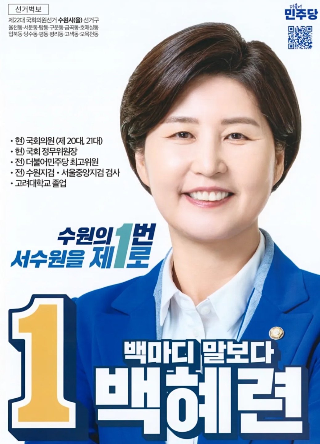 백혜련은 2021년 12월 수원시을 지역구에서 3선 도전을 선언하며, 2022년 3선 의원으로 당선되었습니다. 수원시 최초의 여성 3선 의원이라는 기록을 세운 백혜련은 2025년 3월 20일, 서울 종로구 헌법재판소 앞에서 기자회견 중 계란 테러를 당하기도 했습니다.