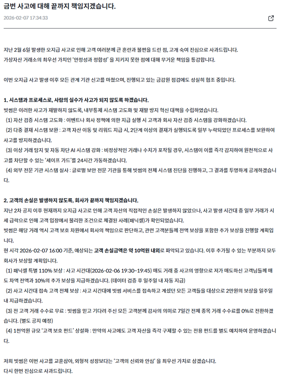 빗썸은 사고 다음 날 기준으로 파악된 고객 손실액이 약 10억 원 수준이라고 설명하며, 이후 추가로 확인되는 피해에 대해서도 전액 책임지고 보상하겠다는 입장을 재차 강조했습니다. 현재 빗썸은 이번 오지급 사고와 관련해 금융감독원 등 관계 기관의 점검을 받고 있으며, 당국 조사에 성실히 협조하겠다고 전했습니다. 또한 가상자산 거래소로서 가장 중요한 가치인 안정성과 신뢰를 지키지 못한 점에 대해 무거운 책임을 느끼고 있다고 밝혔습니다.