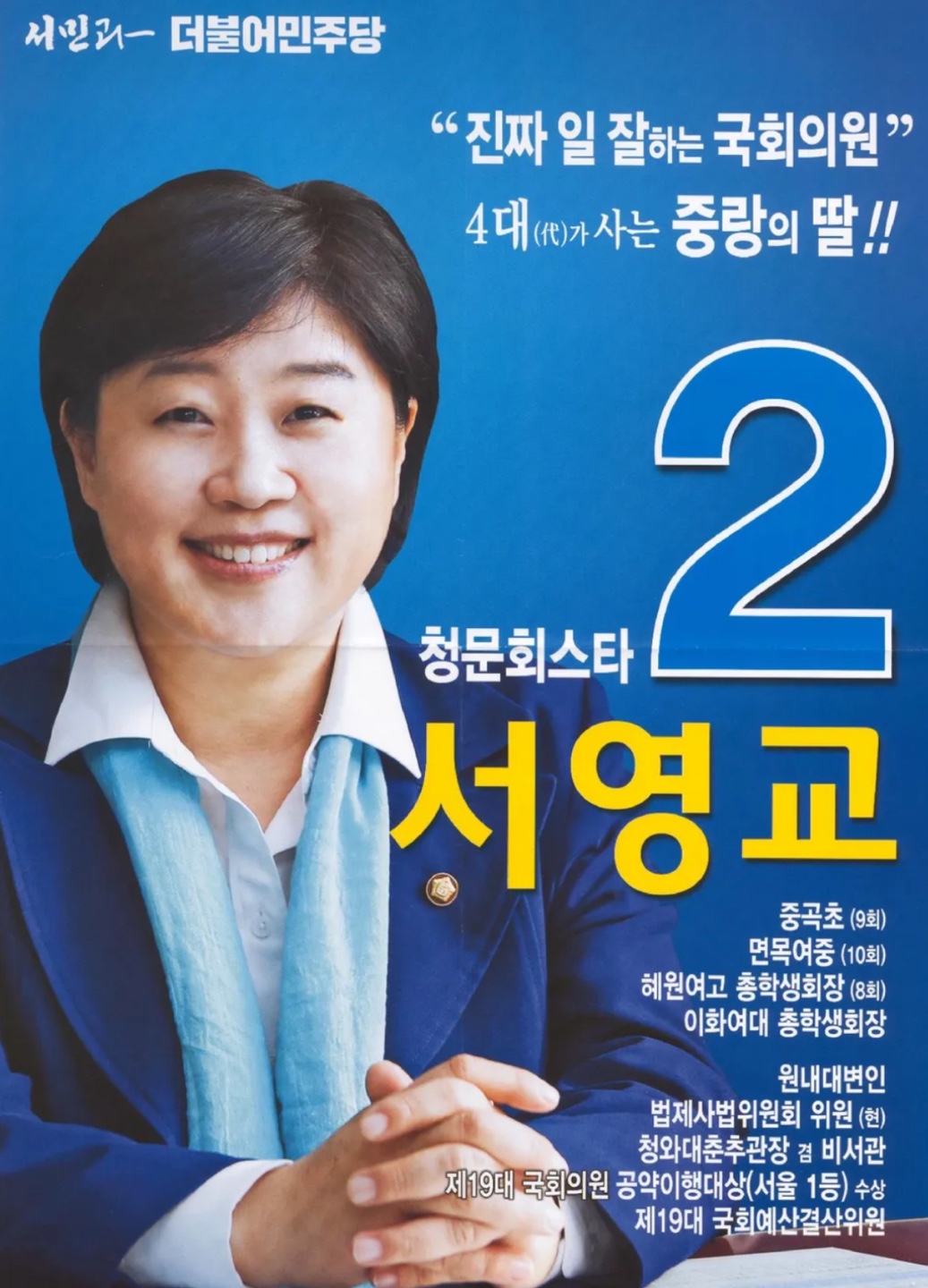 서영교는 더불어민주당 소속의 4선 국회의원으로, 서울 중랑구 갑 지역을 지역구로 두고 활동하고 있습니다. 이화여자대학교 총학생회장 출신으로 학생운동가로 정치에 입문했으며, 지역 밀착형 정치인으로 평가받고 있습니다. 다양한 입법 활동과 정당 내 역할을 통해 꾸준한 존재감을 보여주고 있습니다.