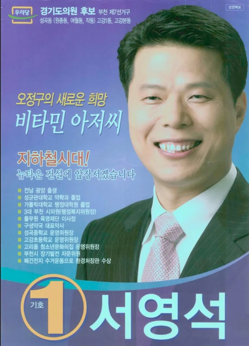 서영석 의원은 1995년 부천시의회 의원으로 첫 정치 활동을 시작했으며, 이후 3선 시의원으로 꾸준히 주민들의 지지를 받았습니다. 2014년에는 9대 경기도의원으로 선출되며 정치적 경력을 한층 더 확장했습니다. 약사 출신답게 건강과 보건 분야에도 깊은 관심을 기울여, 1992년 ‘건강사회를 위한 약사회’ 정책기획단장으로 활동하며 당시 대통령 후보들에게 의료체계 개편을 제안하기도 했습니다. 이는 1998년 김대중 정부가 채택한 의약분업 정책의 초석이 되었다고 평가받고 있습니다.