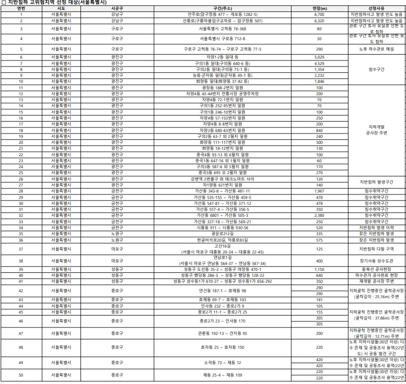 위험 지역으로 분류된 주요 사유는 ▲지하 개발 공사장 인근 ▲과거 지반 침하 사고 빈번 ▲침수 취약 구간 ▲30년 이상 된 노후 지하시설물 밀집 등으로 밝혀졌습니다.