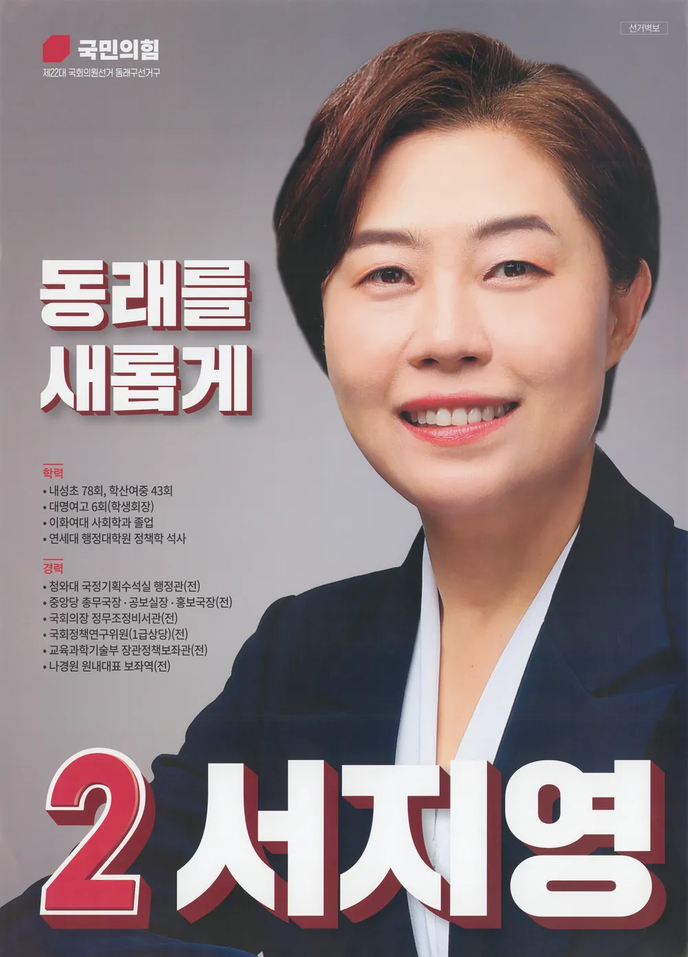 서지영 의원은 오랜 시간 쌓아온 정책 전문성과 지역에 대한 깊은 애정을 바탕으로, 동래구의 교육·문화·복지 발전을 이끄는 데 앞장서고 있습니다. 누구보다도 동래의 역사적 가치를 잘 이해하고 있으며, 이를 미래형 교육도시로 재탄생시키기 위한 실질적인 계획과 실행력을 겸비하고 있습니다. 국회에서의 활발한 입법 활동과 당내 주요 직책 수행을 통해 중앙정치에서도 영향력을 발휘하고 있으며, 주민들과의 소통을 최우선으로 삼는 생활밀착형 정치인으로 자리 잡고 있습니다. 특히 교육 정책에 대한 깊은 관심과 전문성을 바탕으로 미래세대를 위한 실효성 있는 정책을 적극적으로 추진하고 있습니다. 동래구를 모두가 살고 싶은 도시로 만들겠다는 약속 아래, 끊임없이 현장을 누비며 변화를 만들어가고 있습니다. 늘 청년의 자세로 도전하며 진정성 있는 정치를 펼치고 있는 서지영 의원은 앞으로도 국민과 지역을 위한 든든한 일꾼으로서 역할을 다할 것입니다.