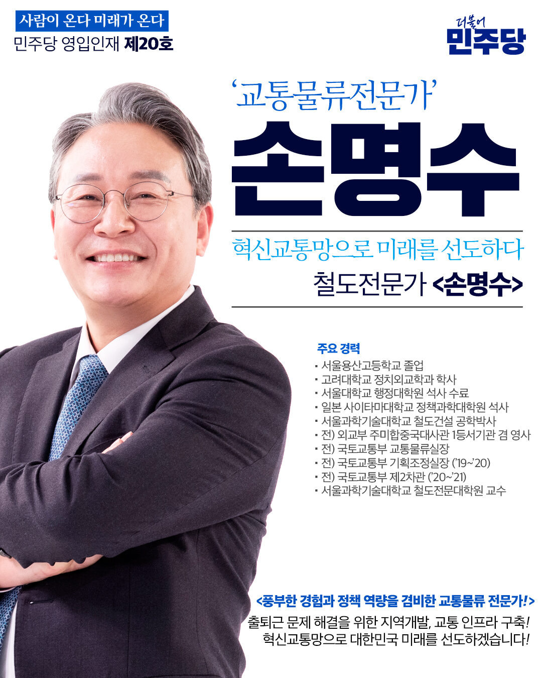 손명수 국회의원은 대한민국의 정무직 공무원 출신 정치인으로, 오랜 관료 생활을 바탕으로 교통·물류 분야에서 두각을 나타낸 전문가입니다. 1966년 11월 9일 전라남도 완도군에서 태어난 그는, 유년 시절부터 성실하고 책임감 있는 성품으로 주변의 신뢰를 받아왔습니다. 서울 용산고등학교를 졸업한 뒤 고려대학교 정치외교학과에 진학해 정치와 사회 전반에 대한 이해를 넓혔으며, 이후 서울대학교 행정대학원에서 행정학 석사 학위를, 일본 사이타마대학교에서 정책학 석사 과정을 수료하며 국제적인 정책 감각도 함께 키워갔습니다. 특히 그는 실무적 전문성을 더욱 심화시키기 위해 서울과학기술대학교 대학원에서 철도건설공학 박사 학위를 취득하며 교통 인프라에 대한 학문적 깊이도 쌓았습니다.