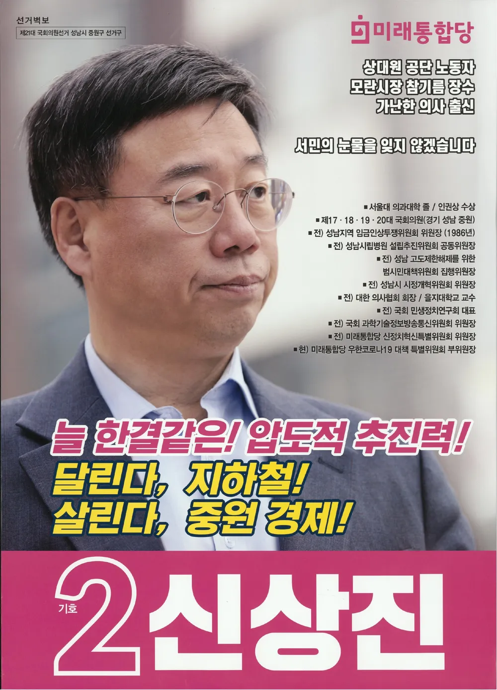 2020년 제21대 총선에서는 더불어민주당의 거센 바람을 넘지 못하고 낙선했으며, 한동안 정치 무대에서 조용히 지내다가 2022년 성남시장 선거에 출마 의사를 밝힙니다. 당시 이명박 전 대통령의 석방을 촉구하는 성명서에도 이름을 올리며, 친이계 중진으로서 정치적 색채를 다시금 드러냈습니다.