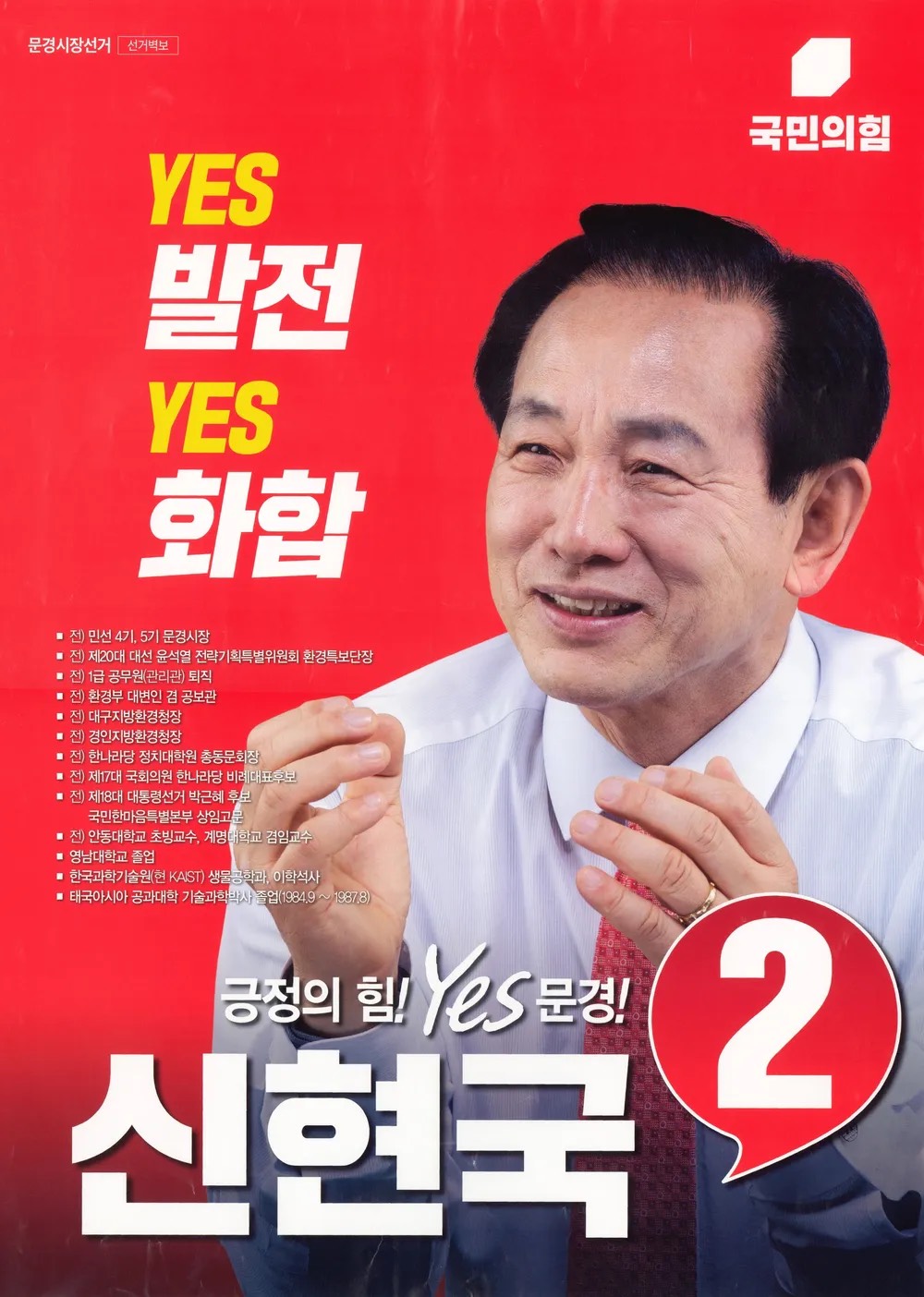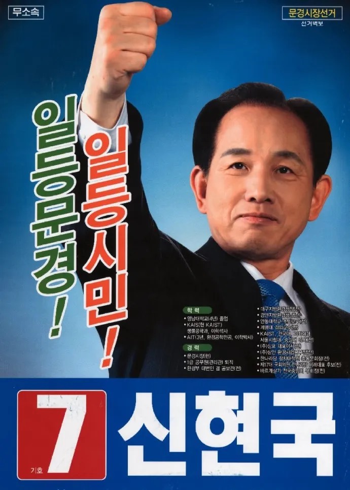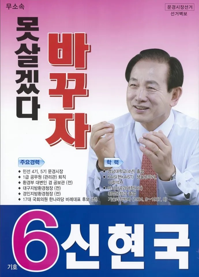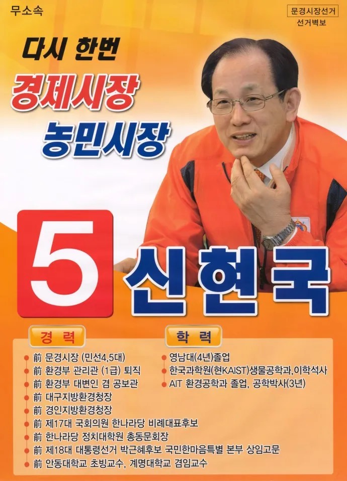 2014년과 2018년 지방선거에도 무소속으로 문경시장에 재도전했으나 두 차례 모두 고윤환 후보에게 패배했다고 합니다. 그러다 2022년 제8회 지방선거에서 국민의힘 공천을 다시 받아 본선에 진출했고, 무소속 후보 두 명과 3자 구도로 치러진 선거에서 54%가 넘는 득표율을 얻으며 11년 만에 시장 자리로 복귀했다고 전해집니다.