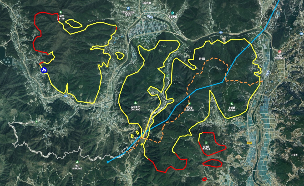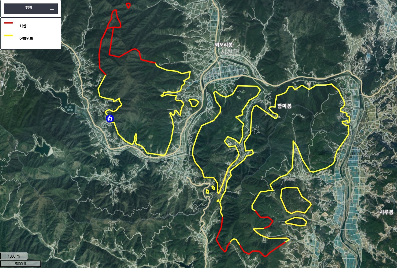 빨간선 : 화선 / 노란선 : 진화완료 / 파란선 : 바람방향