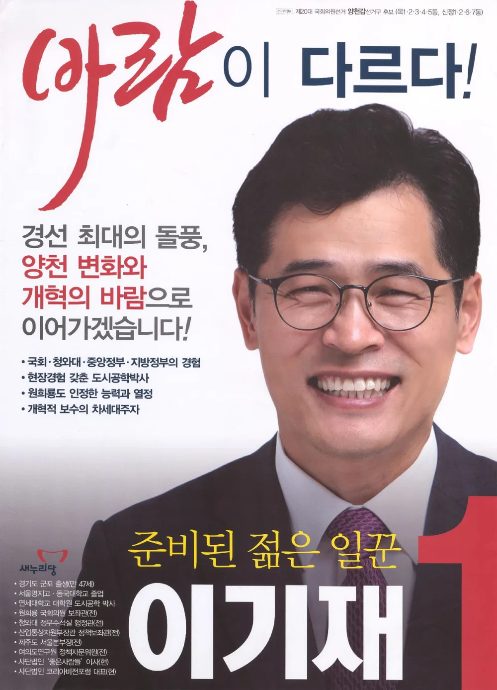 이기재 구청장의 정치 인생은 2007년, 제17대 한나라당 국회의원이었던 원희룡 전 의원의 보좌관으로 시작됐습니다. 그는 단순한 수행이 아닌, 정무 마스터플랜을 직접 설계하고 실행하는 보좌진으로 주목을 받았고, 여의도 정가에서는 ‘3선급 보좌관’이라는 평가를 받기도 했습니다. 이후 한나라당의 당 개혁을 위한 정치 결사체 ‘리셋 대한민국 4.0’의 발기인으로 활동하며, 정치의 본질을 고민하고 실천해왔습니다.