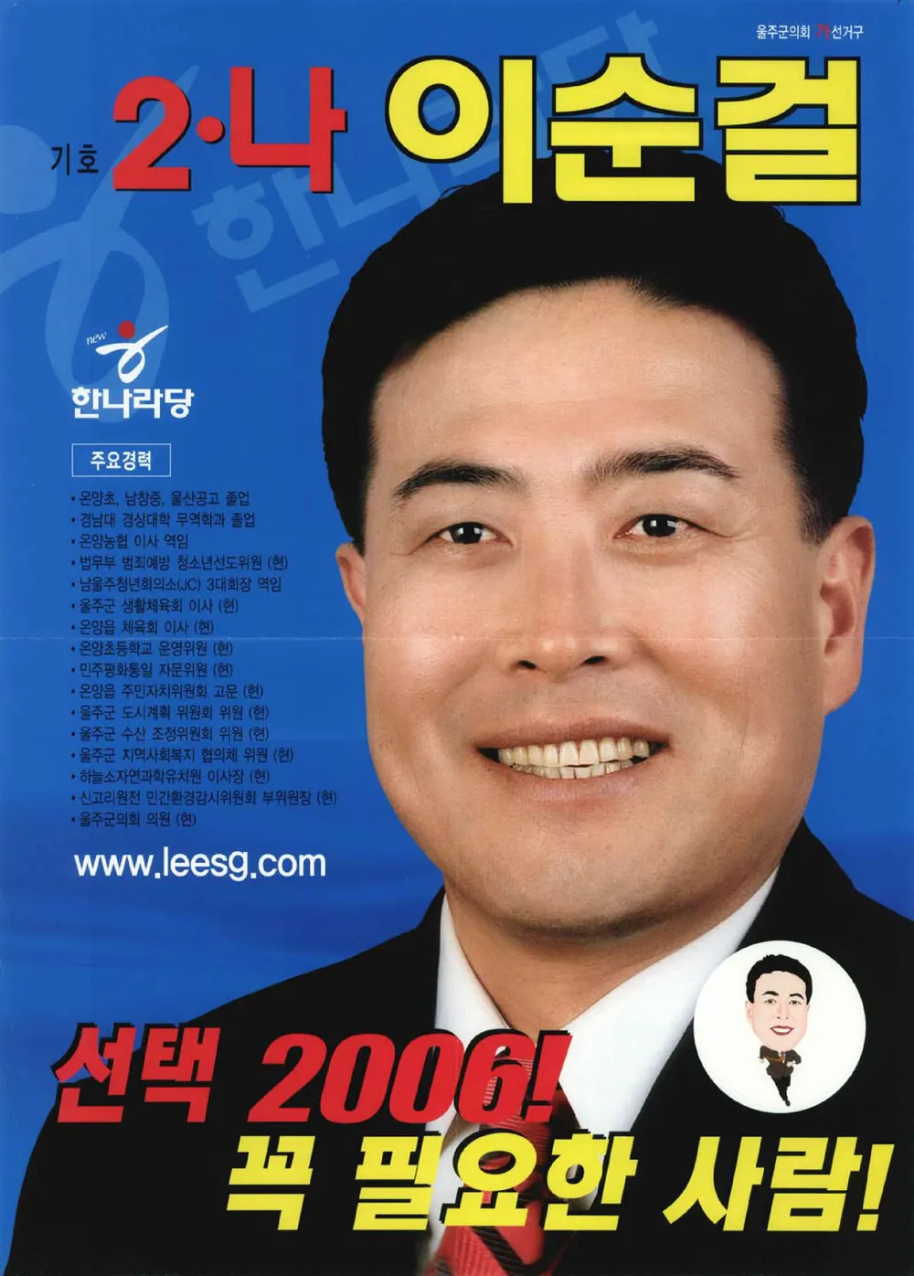 이순걸 군수가 정치에 첫발을 내딛은 것은 2003년 10월, 울산광역시 울주군의회 온양읍 선거구 재보궐선거였습니다. 그는 무소속으로 출마해 군민들의 지지를 받아 당선되면서 본격적인 정치 활동을 시작했습니다. 이때부터 그는 ‘현장에서 답을 찾는 정치인’, ‘소통으로 일하는 군민의 대표’라는 이미지를 굳히기 시작했습니다.
