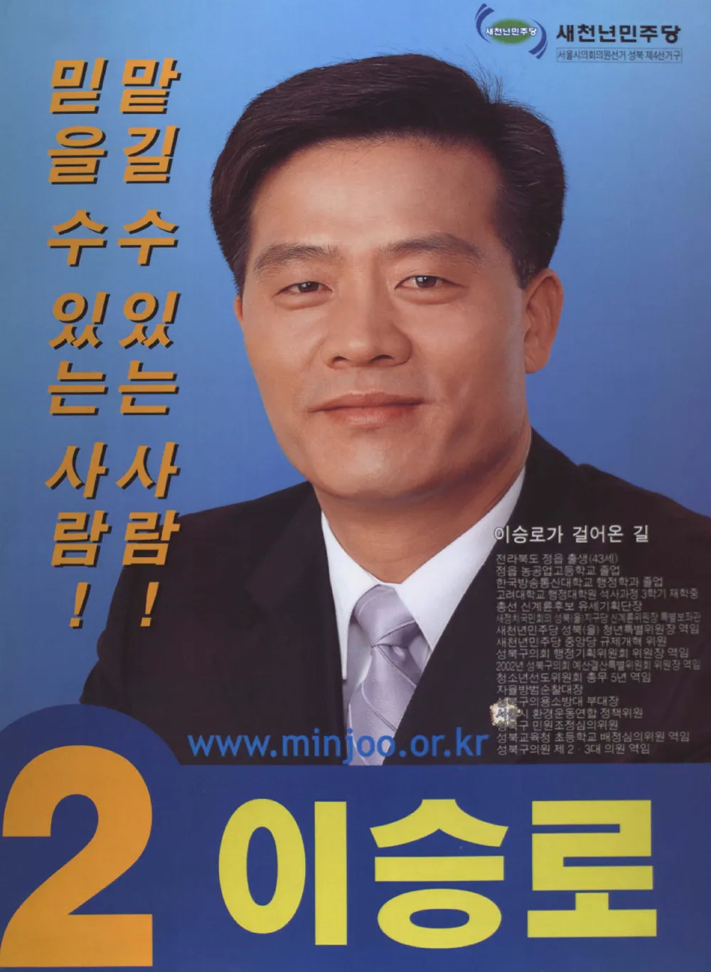이승로 성북구청장은 오랜 시간 지역 사회와 함께 호흡해온 풀뿌리 정치인입니다. 전라북도 정읍에서 농부의 아들로 태어나 가난한 환경 속에서도 성실함과 책임감을 바탕으로 성장해왔습니다. 서울 성북구로 이주한 뒤 지역 정치를 시작했으며, 구의원과 시의원을 거치며 풍부한 의정 경험을 쌓았습니다. 주민과 직접 소통하는 현장 중심 행정을 철학으로 삼고, 실질적인 변화와 복지를 실현하는 데 힘써왔습니다. 청년, 아동, 어르신 등 모든 세대를 아우르는 정책으로 ‘함께 잘사는 성북’을 만들기 위해 노력하고 있습니다. 특히 청년 창업·주거 지원, 지역화폐 도입, 복지 인프라 확대 등 실질적이고 지속가능한 사업을 적극 추진하고 있습니다. 현재 제42·43대 성북구청장으로 재직 중이며, 성북의 내일을 설계하는 행정을 이어가고 있습니다.