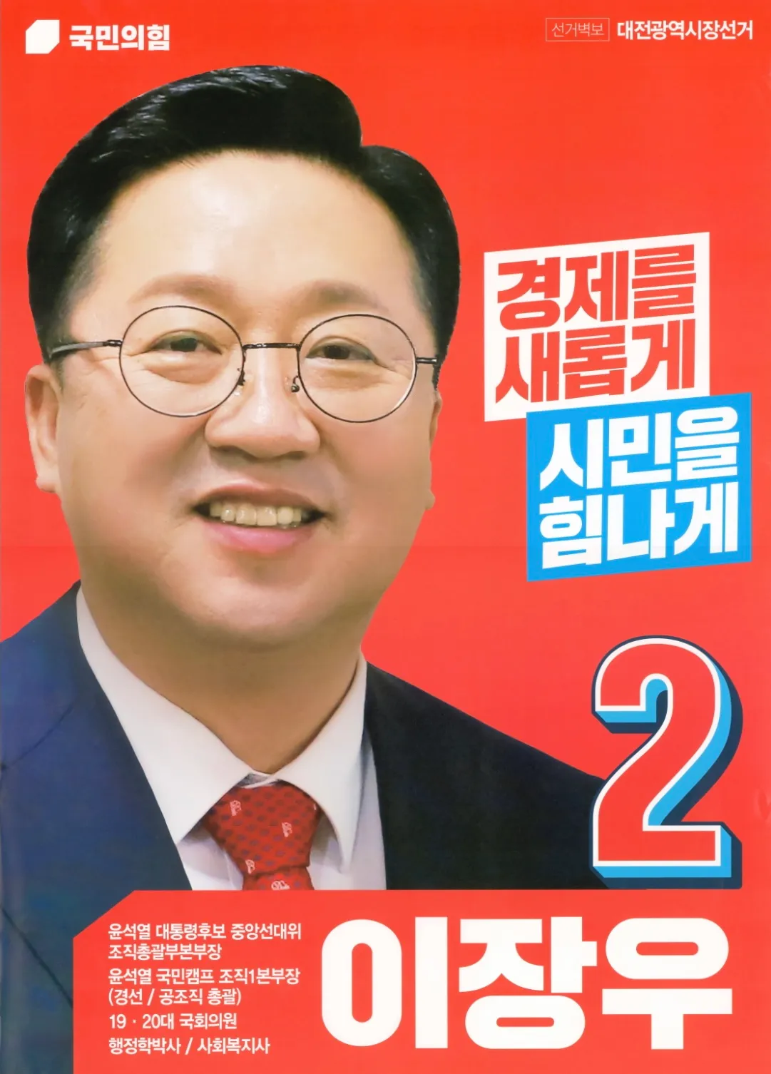 이장우 대전광역시장은 행정 전문성과 정치적 경륜을 바탕으로 대전의 미래 비전을 이끌어가고 있는 국민의힘 소속의 지방행정 리더입니다. 충청남도 청양에서 태어나 대전에서 학업과 정치 활동을 이어온 그는, 대전대학교 총학생회장 출신으로 일찍부터 공공 리더십을 갖춘 인물로 평가받아 왔습니다. 국회의원 보좌관을 시작으로 동구청장, 국회의원을 거쳐 현재는 대전광역시장으로 재직하며 다양한 행정 경험을 축적해 왔습니다. 젊은 시절 무소속 출마와 낙선을 겪으며 정치적 내공을 다졌고, 이후 꾸준한 지역 활동과 실무 중심의 의정 활동으로 입지를 다졌습니다. 특히 국회의원 시절 대전역 복합역사 추진과 예산 확보를 통해 지역 발전에 실질적인 기여를 하였습니다. 2022년 대전시장 선거에서는 치열한 접전 끝에 당선되며 시정 운영의 주도권을 확보했고, 현재는 시의회 다수 의석을 기반으로 강한 추진력을 발휘하고 있습니다. 시민 의견을 중시하는 행정 철학과 창의적인 도시 마케팅 전략으로, 대전의 미래 경쟁력을 높이는 데 주력하고 있습니다.