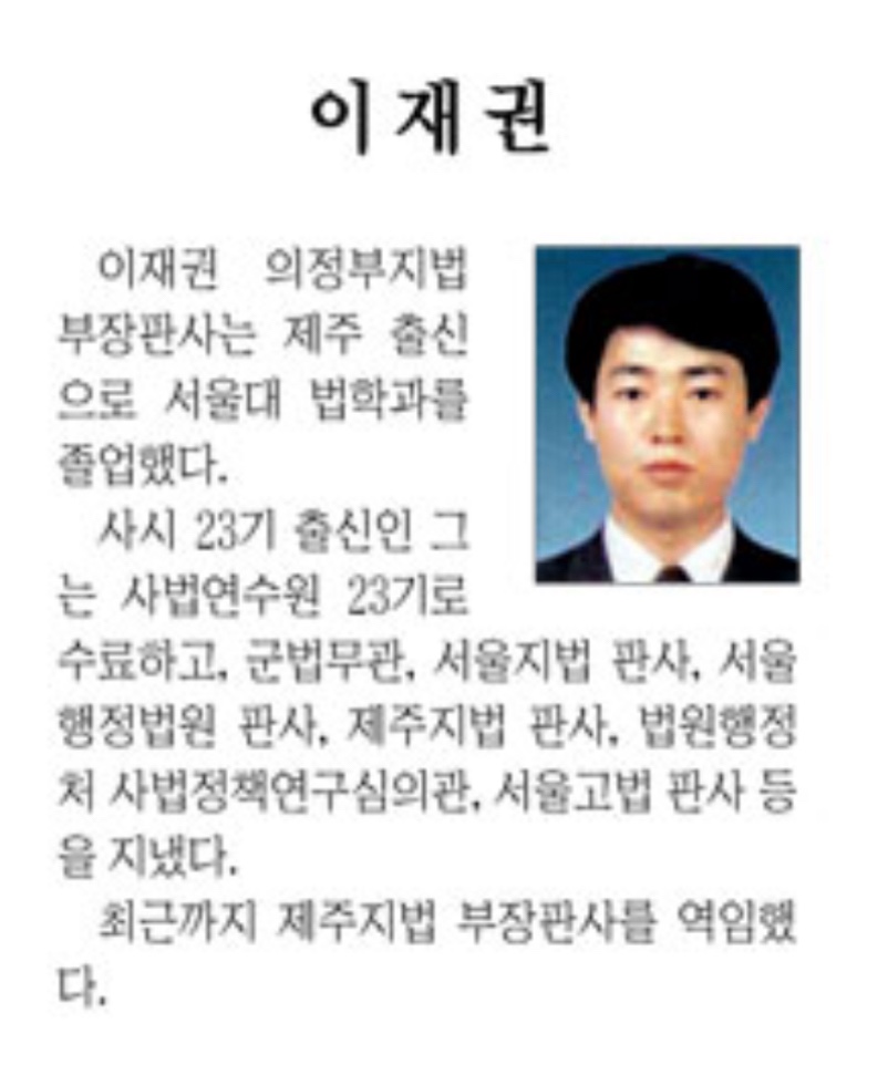 이재권 판사는 서울대학교 법과대학을 졸업하고 제33회 사법시험에 합격한 법조인입니다. 다양한 법원에서 판사와 부장판사로 재직하며 형사·민사 분야의 중대한 사건을 공정하게 심리해 왔습니다. 특히 역사적 의미가 큰 재심 사건과 정치적으로 민감한 재판을 맡으며 법의 원칙과 정의 실현에 기여해 왔습니다. 현재는 서울고등법원 형사7부 재판장 / 부장판사로 재직 중이며, 사회적 관심이 집중된 주요 사건들을 맡고 있습니다.