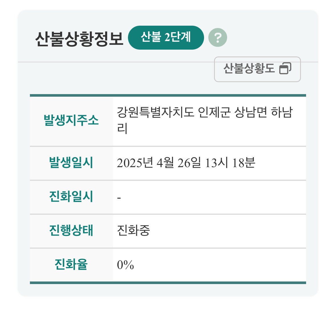 2025년 4월 26일 오후 1시 11분경, 강원특별자치도 인제군 상남면 하남리의 한 야산에서 산불이 발생했습니다. 산불은 빠르게 확산되었고, 이에 산림청은 이날 오후 2시 30분에 산불 대응 단계를 ‘1단계’로 발령한 데 이어, 오후 4시 45분에는 ‘2단계’로 격상해 대응에 나섰습니다. 산불 대응 2단계는 피해 면적이 50~100헥타르 이상으로 예상되거나 평균 풍속이 초속 7~11미터에 달할 때, 그리고 진화에 10~48시간 정도가 소요될 것으로 판단될 때 발령되는 단계입니다.