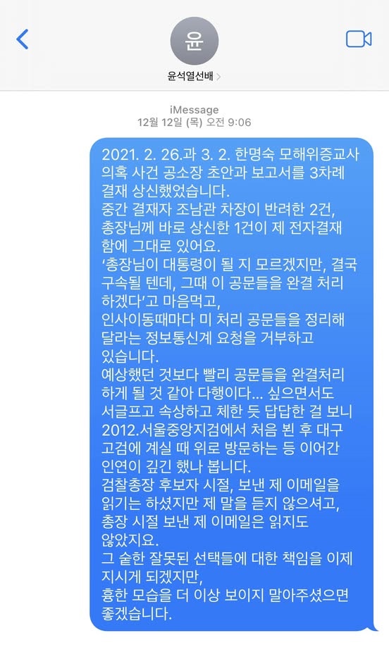 항상 검찰 내부의 자성의 목소리를 내는 임은정 검사는 윤석열과의 관계에서 늘 대척점에 서있습니다. 지난 12월 12일에는 임은정 검사 자신이 윤석열에게 보낸 "더 흉한 모습 보이지 않길" 문자를 공개했고 25년 1월 10일 라디오에 출연해서는 "감옥 가는 걸 하루라도 늦추려 처절히 반항하는 게 안쓰러" 다고 말했습니다.