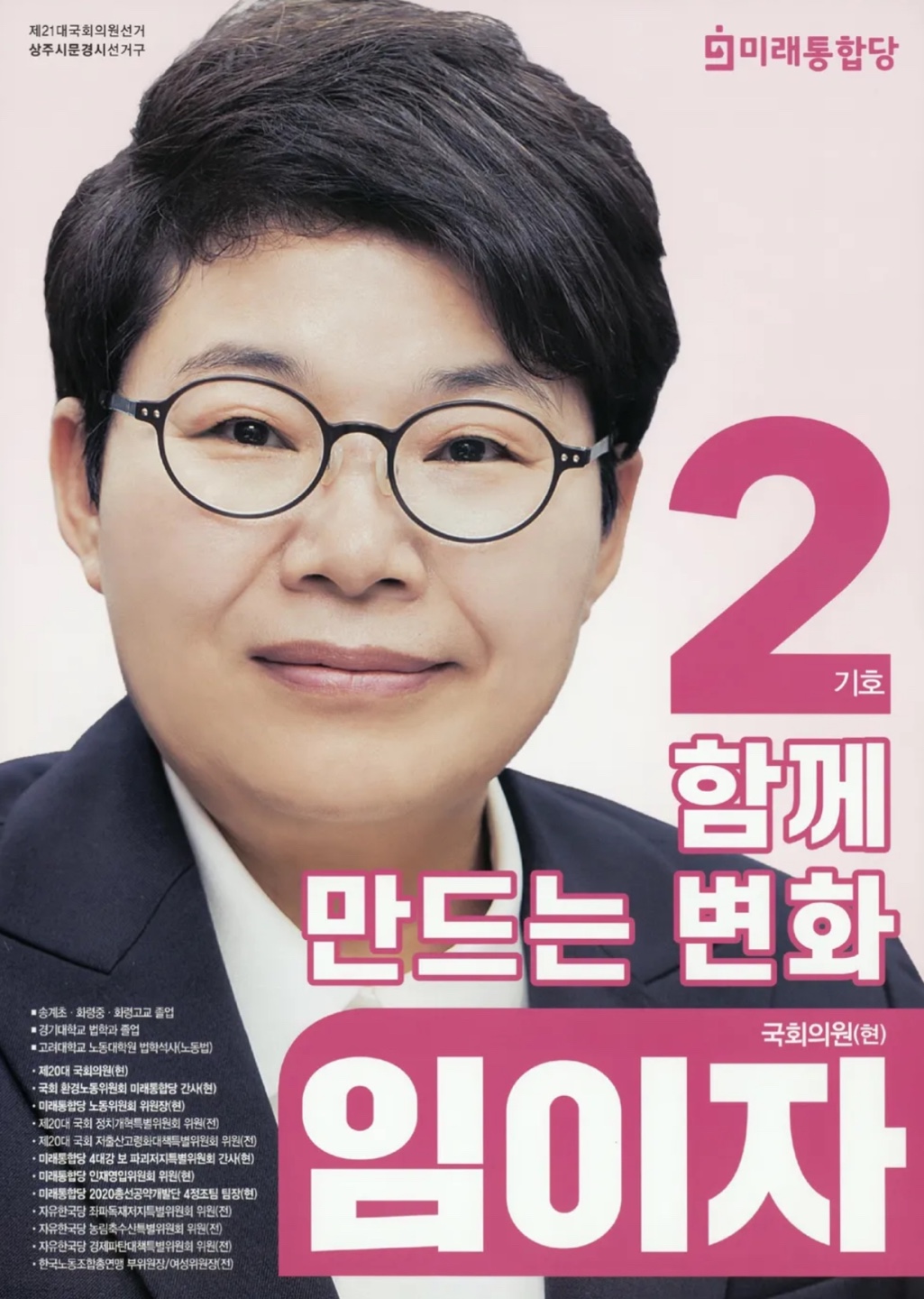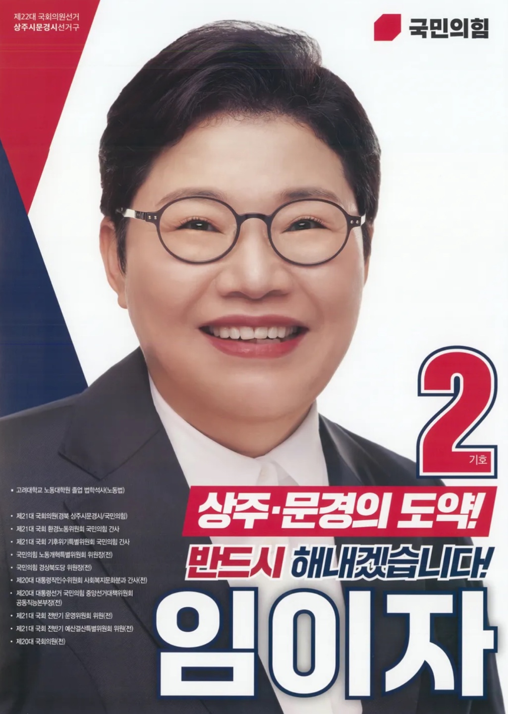 임이자 의원은 노동운동가 출신으로, 보수 정당 내에서 드물게 노동 현안을 꾸준히 챙겨온 실천형 정치인입니다. 제20대 국회에서는 비례대표로, 이후에는 경북 상주시·문경시 지역구 국회의원으로 당선되어 3선 의원으로 활약하고 있습니다. 오랜 현장 경험과 소신 있는 의정활동으로 ‘노동을 아는 정치인’이라는 평가를 받고 있습니다.