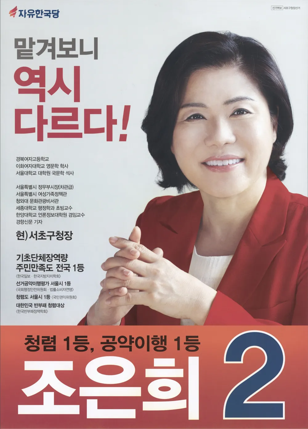 2018년 제7회 지방선거에서는 자유한국당 후보로 재선에 성공하며, 서울시 내 유일한 야당 소속 구청장으로 자리매김합니다. 당시 여당 지지율이 압도적으로 높았고, 서초구 내 다른 선거에서는 모두 민주당 후보가 승리한 상황 속에서 조은희만이 독보적인 행정 성과와 중도적 이미지로 재선에 성공했습니다. 특히 상대 후보가 정당 중심의 캠페인을 펼친 반면, 조은희는 보수 정당의 색채를 최소화하고 ‘일 잘하는 구청장’이라는 이미지로 지역 주민들의 지지를 얻었습니다.