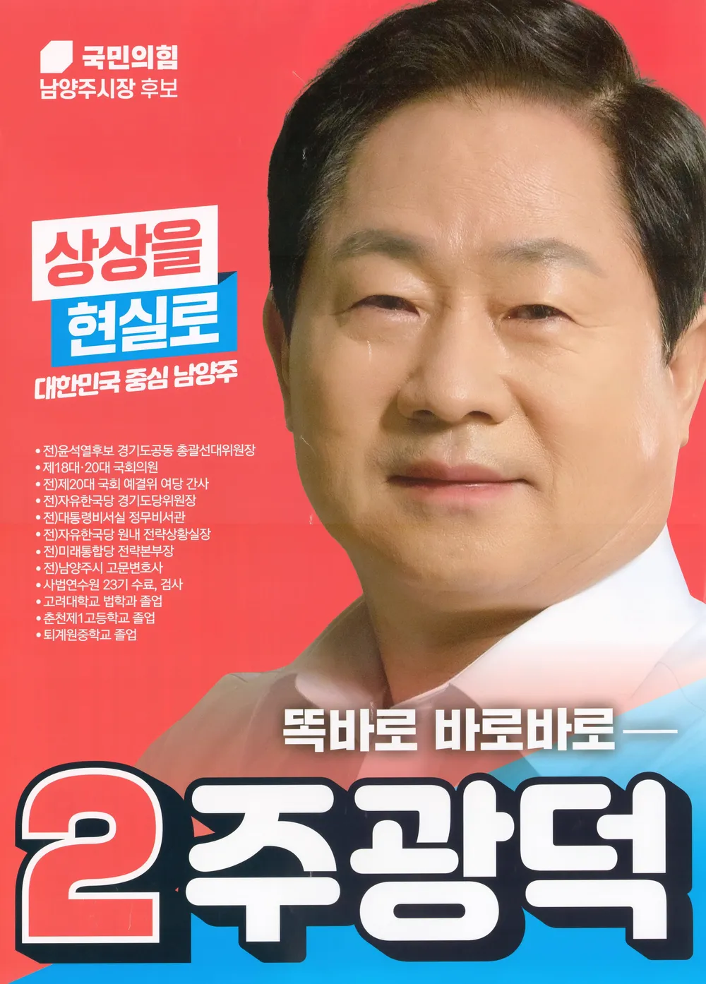 주광덕은 검사 출신의 법조인으로, 국회의원을 거쳐 현재 남양주시장을 맡고 있는 실무형 정치인입니다. 1960년 경기도 구리에서 태어나 법학을 전공한 그는 사법시험 합격 후 검사로 근무하다가 변호사로 개업하며 민생 현장에 발을 들였습니다. 정치권에는 2004년 첫 도전을 시작으로, 2008년 한나라당 후보로 국회에 입성하며 본격적인 정치 여정을 시작했습니다. 특히 음주운전 사망 사고에 대한 강력 처벌 법안, 성범죄자의 교직 임용 제한 등 현실적인 입법 활동으로 주목을 받았고, 조국 전 장관 청문회에서의 날카로운 질의로 대중적인 인지도를 높였습니다. 2022년에는 남양주시장으로 선출되어 교통망 확충, 기업 유치, 도시 인프라 개선 등에 주력하며 행정가로서의 역량을 발휘하고 있습니다. 경기북부 분도 논의 등 지역 발전에 대한 적극적인 목소리를 내며 기초자치단체장을 넘어 광역행정에도 영향력을 넓히고 있습니다. 2025년 현재, 임기 말에 접어든 그는 차기 행보에 대한 정치권의 관심을 한몸에 받고 있는 인물입니다.