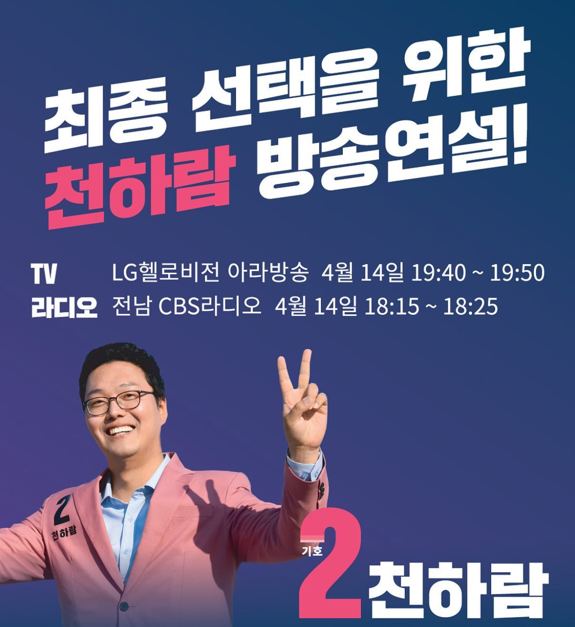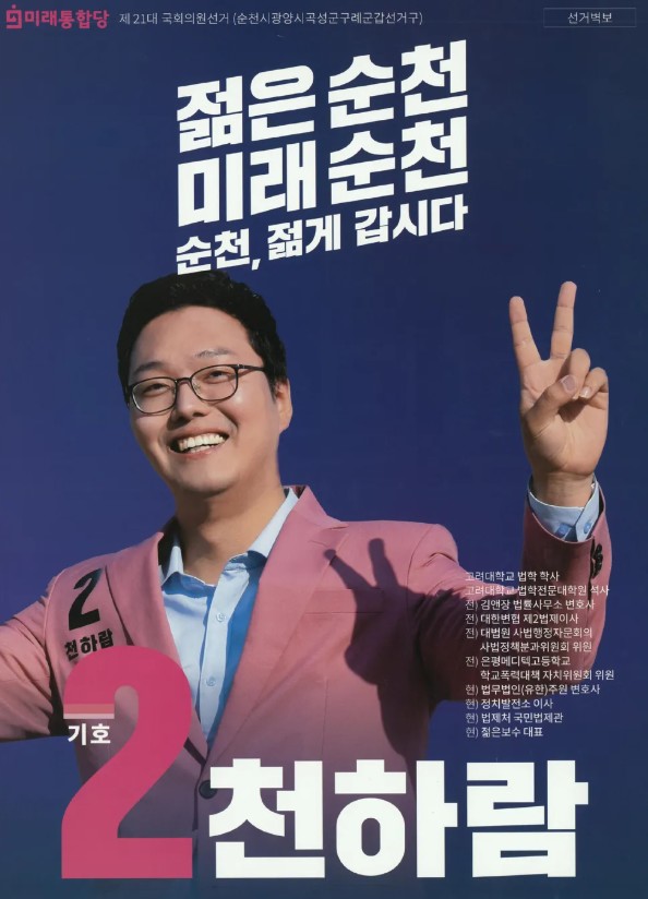 천하람은 미래통합당의 공천을 받았지만, 선거 과정에서 많은 어려움을 겪었다. 선거 자금이 부족한 상황에서, 시민들에게 명함을 나누는 데 어려움이 있었고, 많은 사람들이 그의 명함을 받지 않거나, 당의 로고 색깔을 보고 비웃음을 받기도 했다. 그럼에도 불구하고, 그는 선거를 포기하지 않고 선거를 완주했다. 결과적으로 천하람은 3.02%(4,058표)의 득표를 기록했으며, 많은 어려움 속에서도 순천 시민들에게 감사의 뜻을 전하고 순천에서 변호사 사무실을 개업하여 지역에 뿌리를 내리겠다고 다짐했다. 또한, 선거구 획정 문제에 대해 헌법소원을 제기하는 등 선거 결과에 대한 불만을 법적으로 해결하고자 했다.
