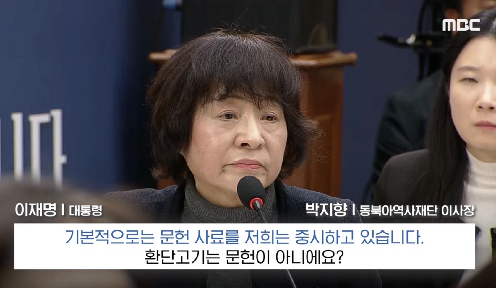 이에 대해 박 이사장은 재야 사학자들의 주장보다는 전문 연구자들의 연구 성과가 훨씬 설득력이 있다고 답하며, 역사 연구는 기본적으로 사료에 근거해야 하고 특히 문헌 사료를 중시할 수밖에 없다는 점을 강조했습니다. 이 대통령은 이에 대해 역사를 바라보는 시각과 입장의 차이가 근본적인 갈등의 원인인 것 같다고 언급하며, 쉽지 않은 고민거리라는 말로 대화를 마무리한 것으로 전해집니다.