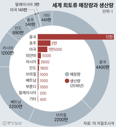 전 세계 히토류 생산량의 약 60~70%를 차지, 정제 능력까지 독점