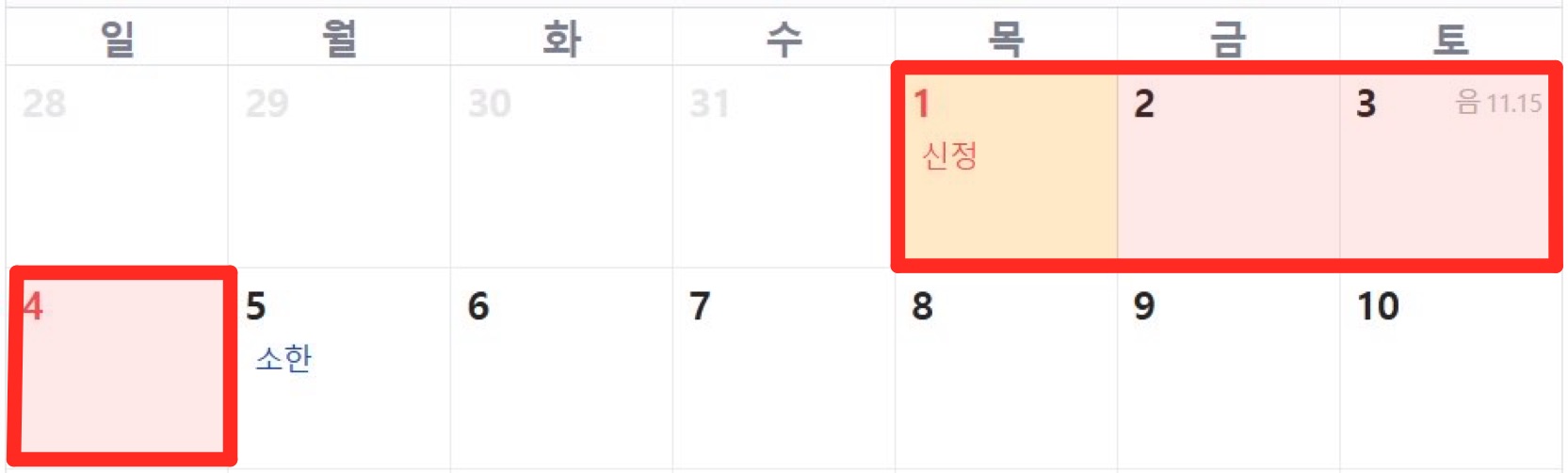 1일(목요일) ~ 4일(일요일) 4일간 연휴 가능