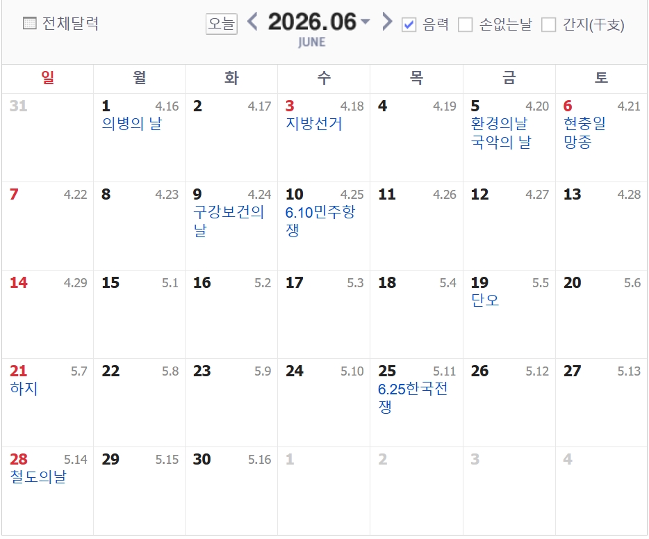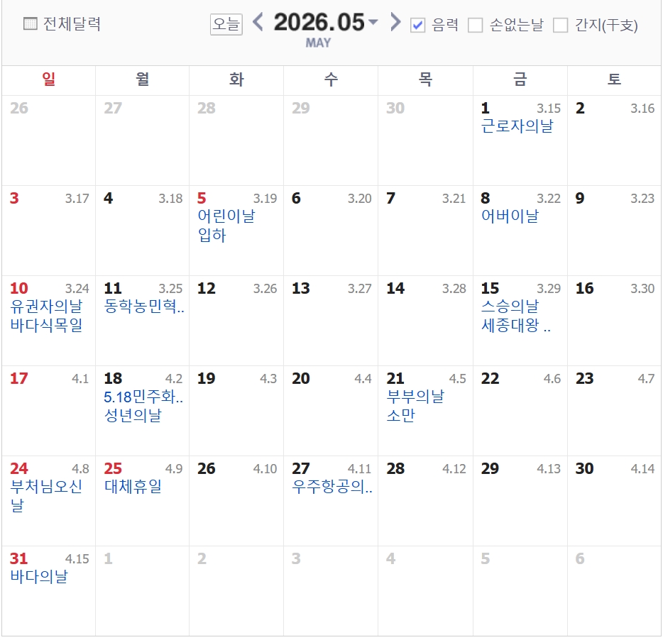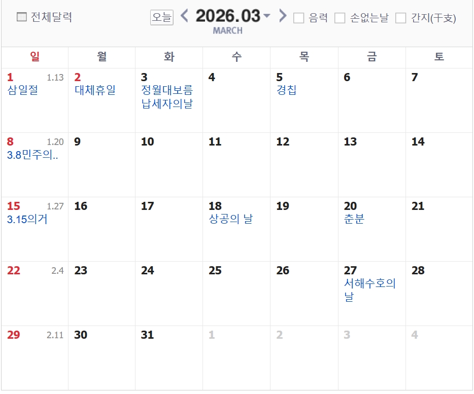 공식 자료 기준으로 2026년 관공서 공휴일은 원래 72일로 계산되었지만, 3·1절과 부처님오신날이 일요일과 겹치면서 실제 휴일 수는 71일로 조정되었다고 합니다. 여기에 6월 3일 지방선거가 임시 공휴일로 포함되며 상반기 휴일 구조가 조금 달라졌다고 전해집니다. 선거일은 법률에 따라 공휴일로 지정되므로 2026년에도 동일하게 적용된다고 합니다.