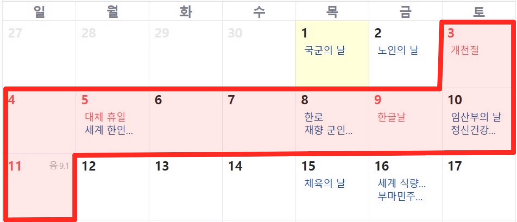 3일(토요일) ~ 11일(일요일) 9일간 연휴 가능