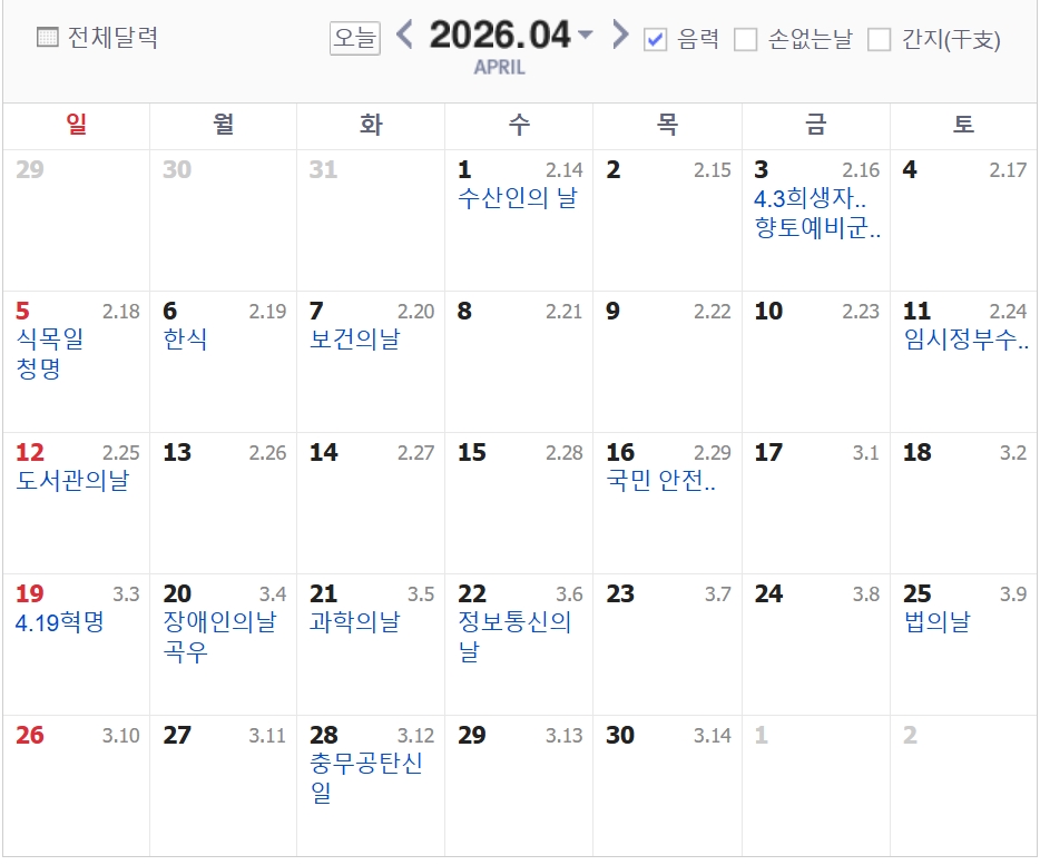 ❖ 2026년 병오년 휴일 일수 / 휴무일